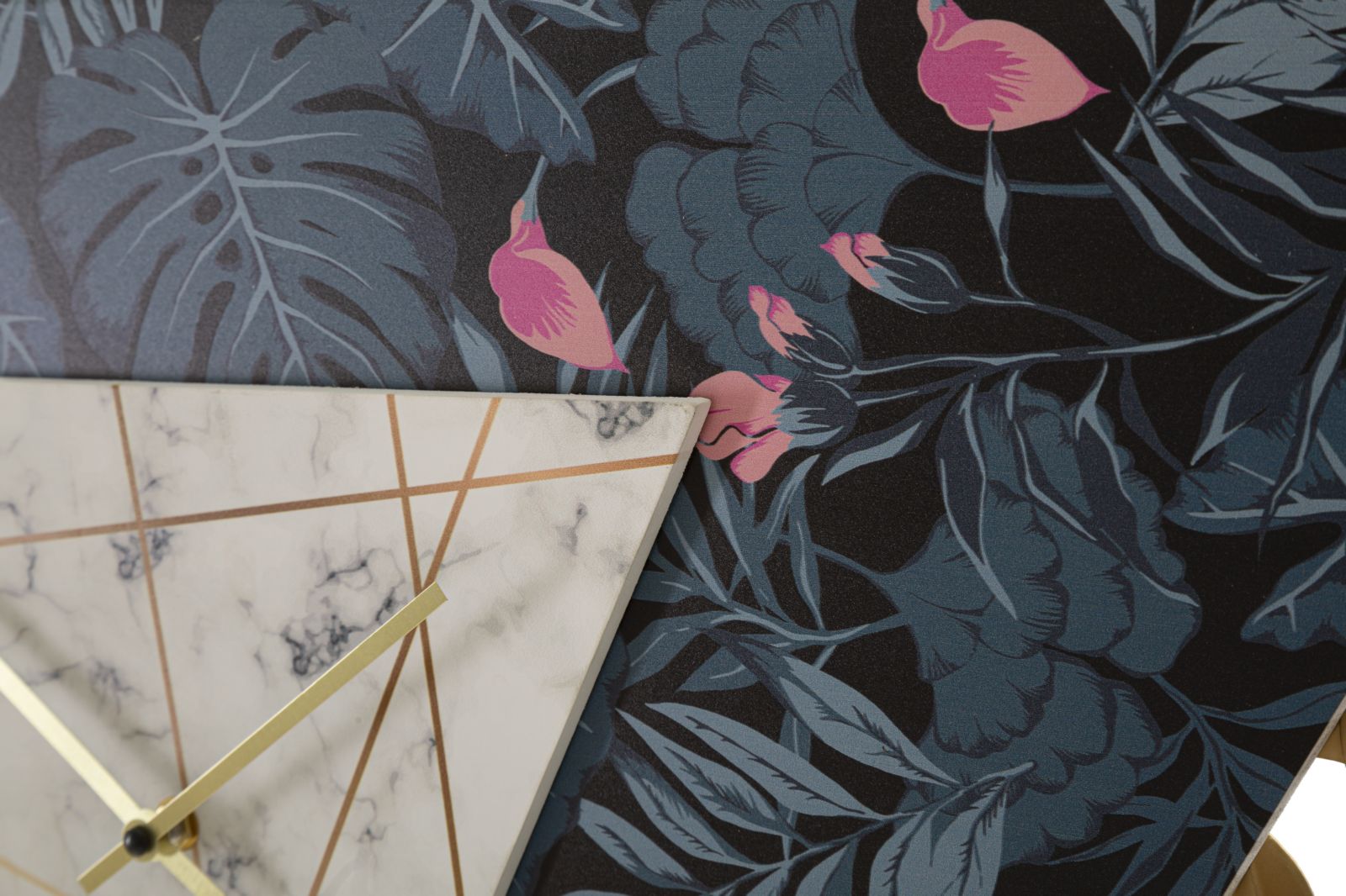 L'orologio da parete triangolare in ferro e legno MDF è un pezzo d'arredo che unisce design moderno e materiali naturali, creando un elemento visivamente intrigante e versatile per il salotto o la cucina.