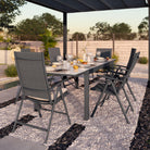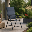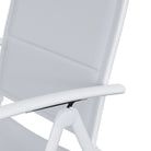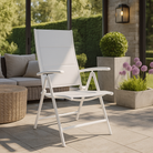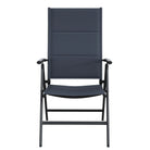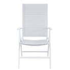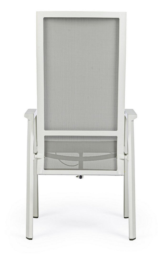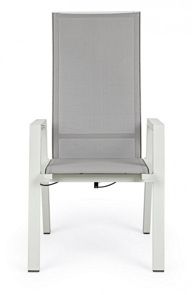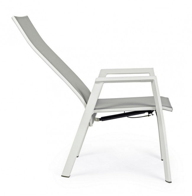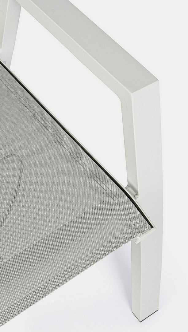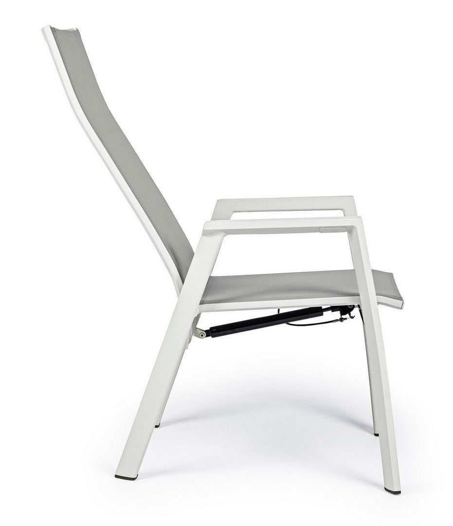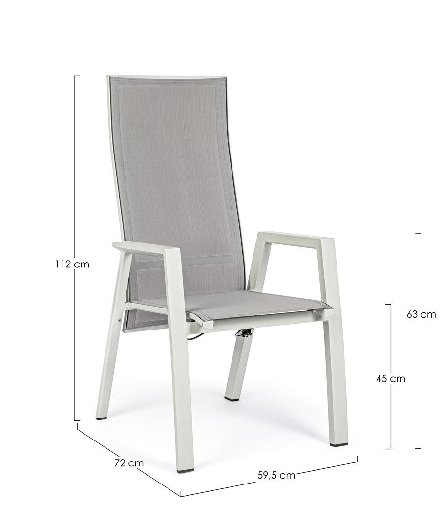 Sedia con braccioli pieghevole in multiposizioni da esterno per giardino o terrazzo della serie ORION con la struttura in alluminio verniciato mentre la seduta e lo schienale sono in Textilene trapuntato per un'accoglienza morbida ed elastica. Il suo schienale si inclina in 7 posizioni e si adatta facilmente ai diversi usi.