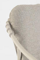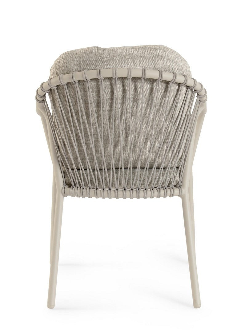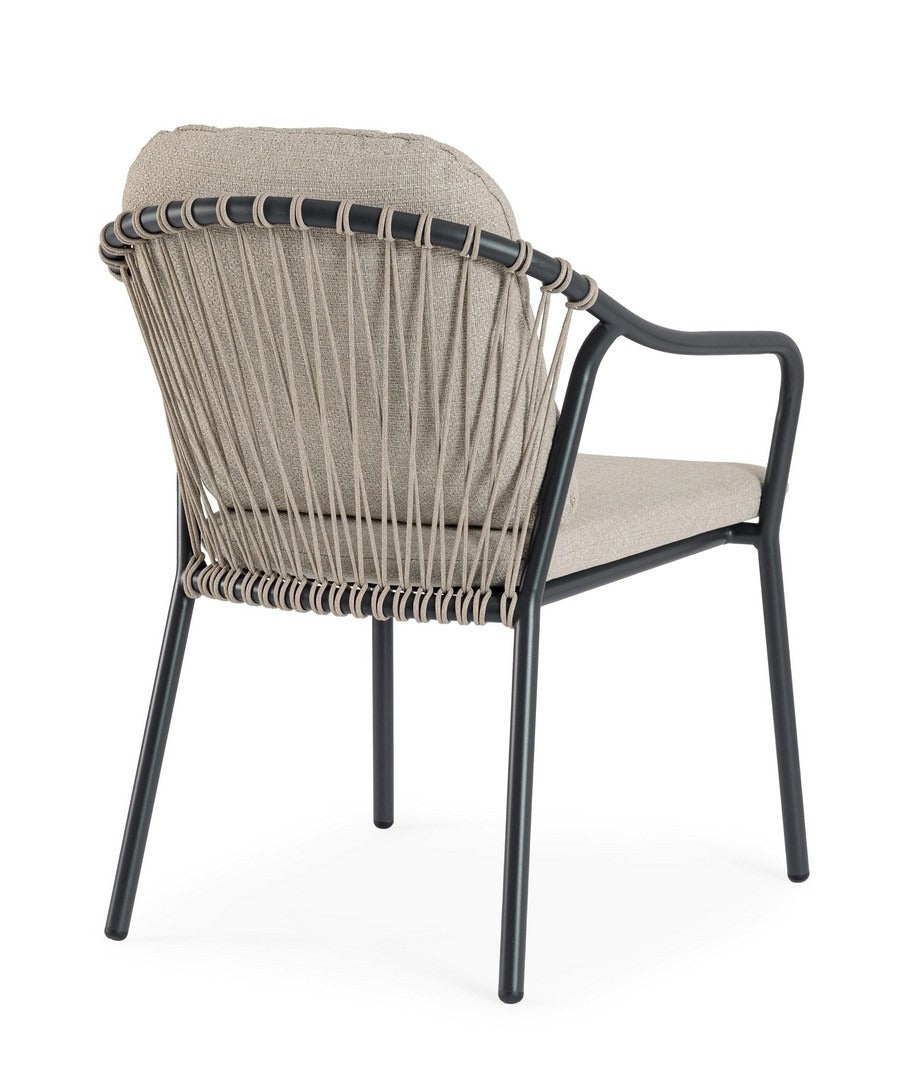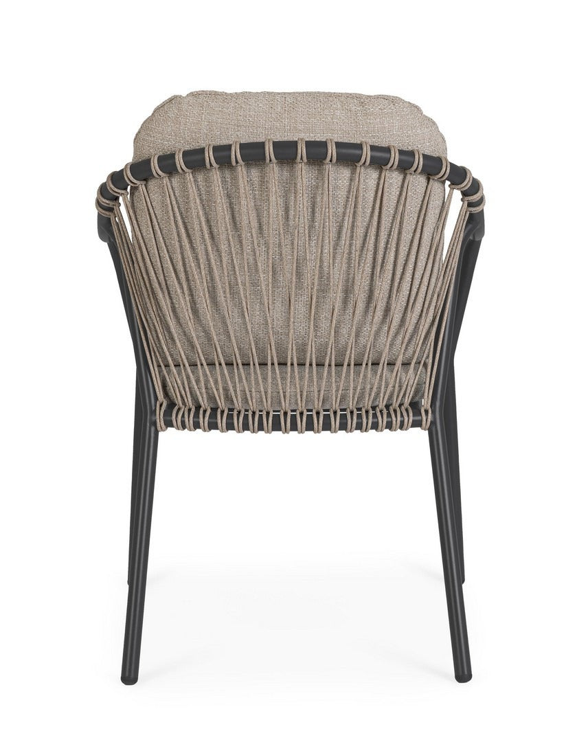 Schienale con intreccio in corda Olefin, elegante, robusto e pensato per garantire comfort e traspirabilità.