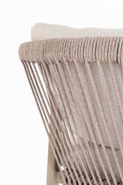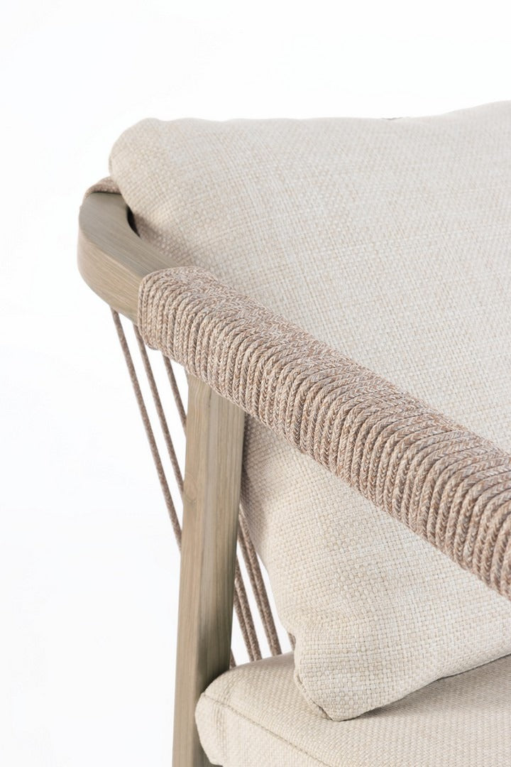La combinazione tra la struttura in alluminio e l’intreccio in corda di poliestere conferisce un equilibrio perfetto tra leggerezza visiva e solidità, rendendola ideale tanto per gli spazi interni quanto per quelli esterni.