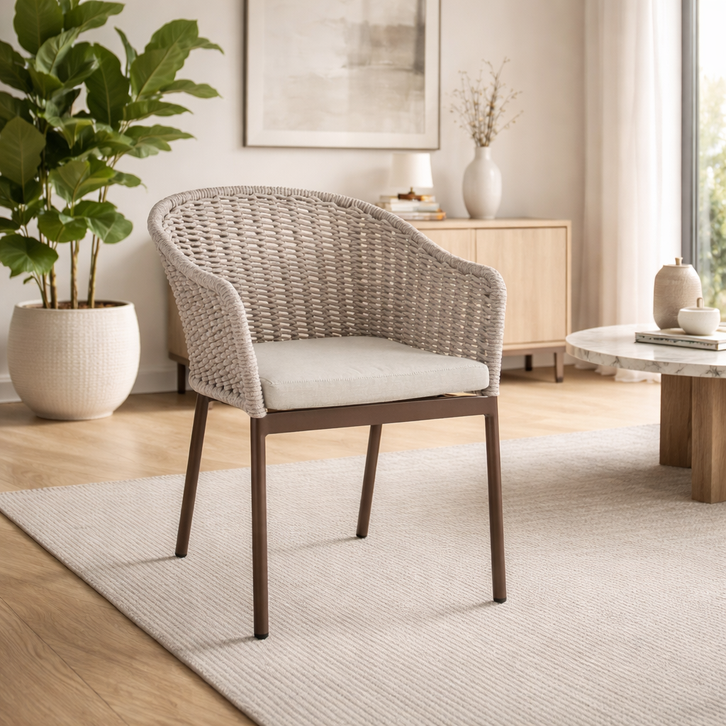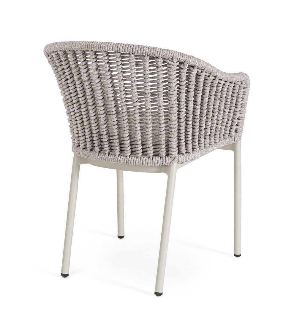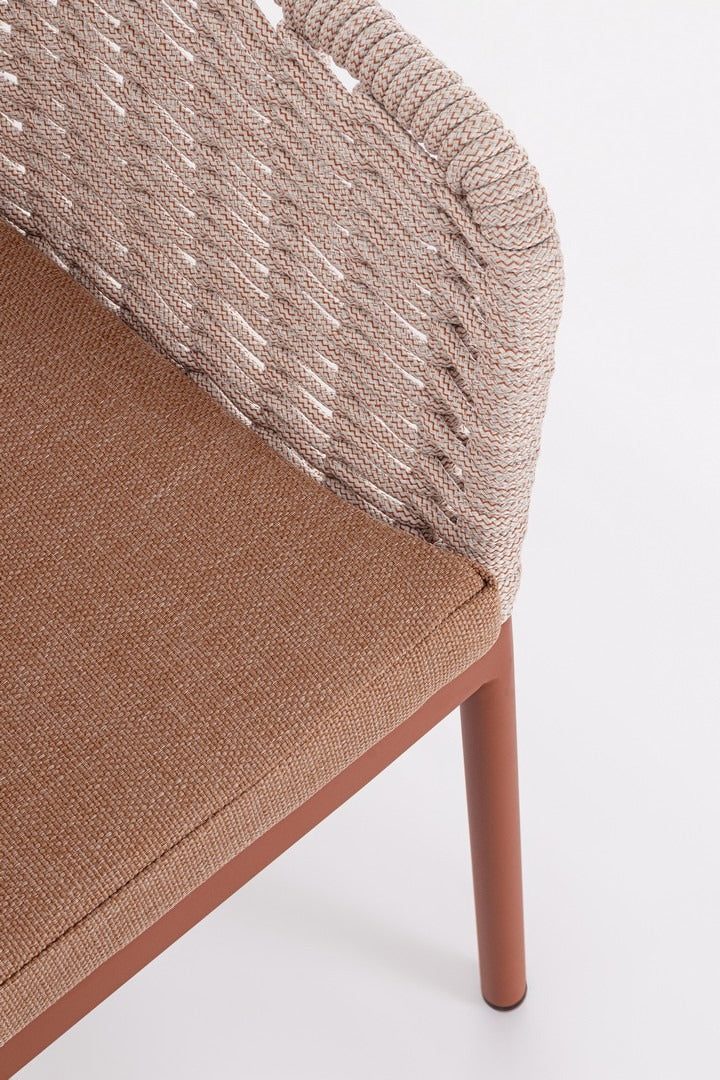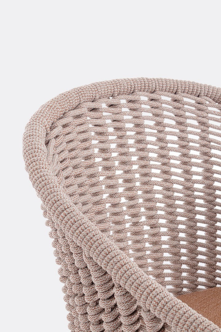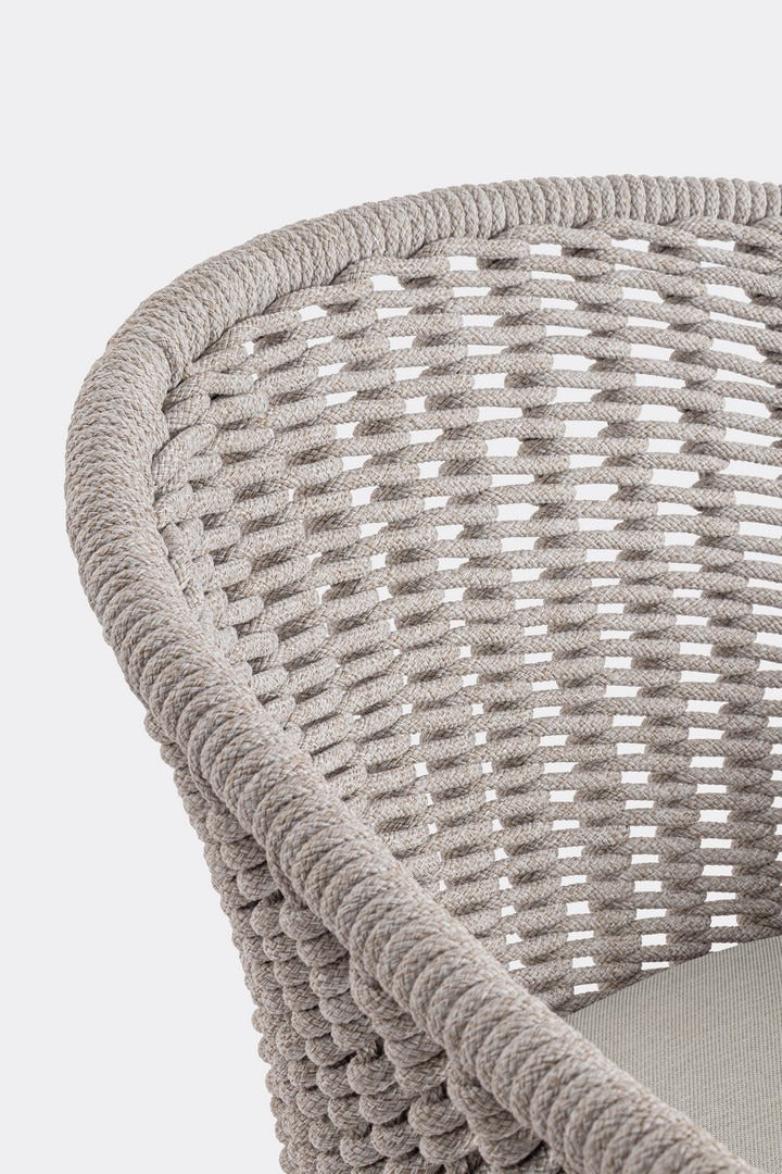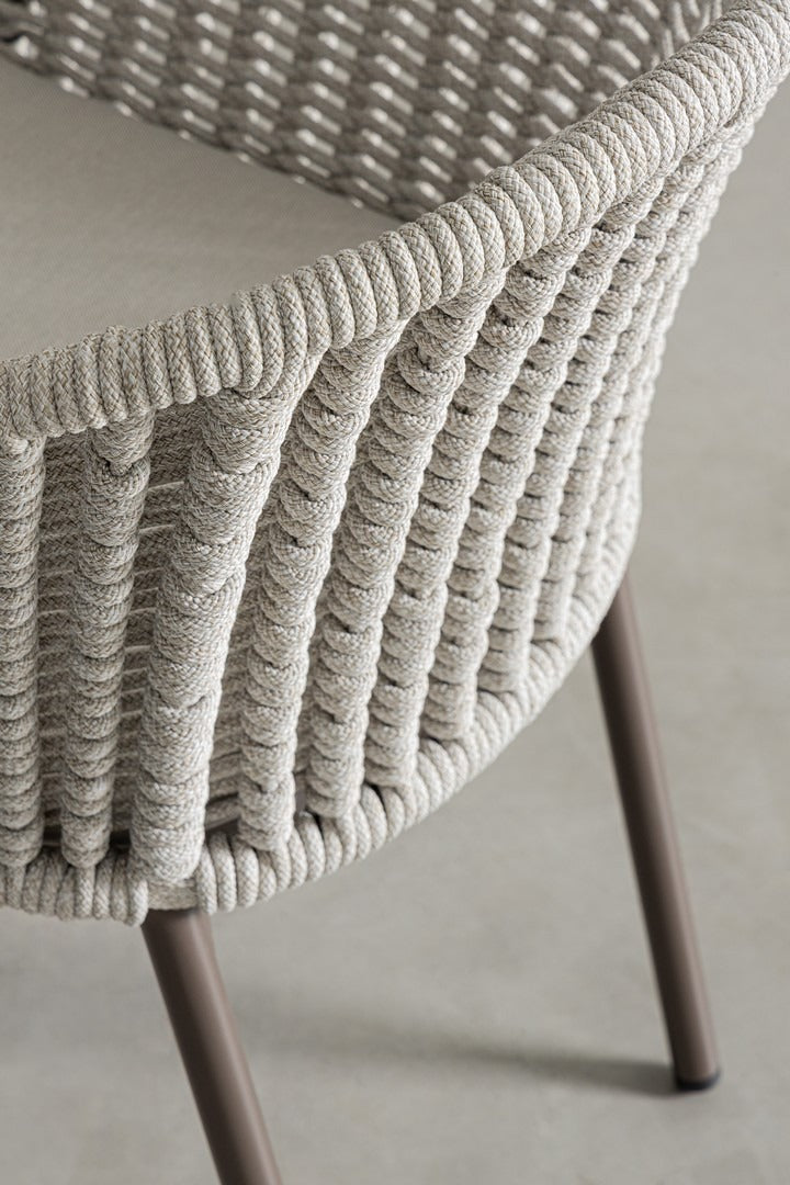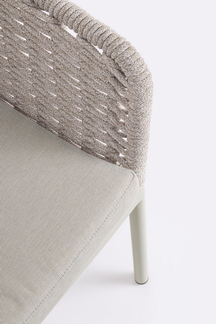 Il suo design equilibrato unisce la leggerezza visiva dell’intreccio in corda alla solidità della struttura in alluminio, creando una seduta accogliente e raffinata.