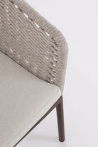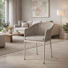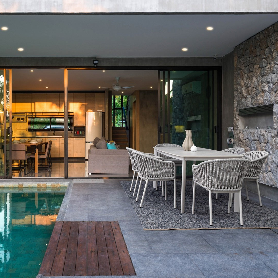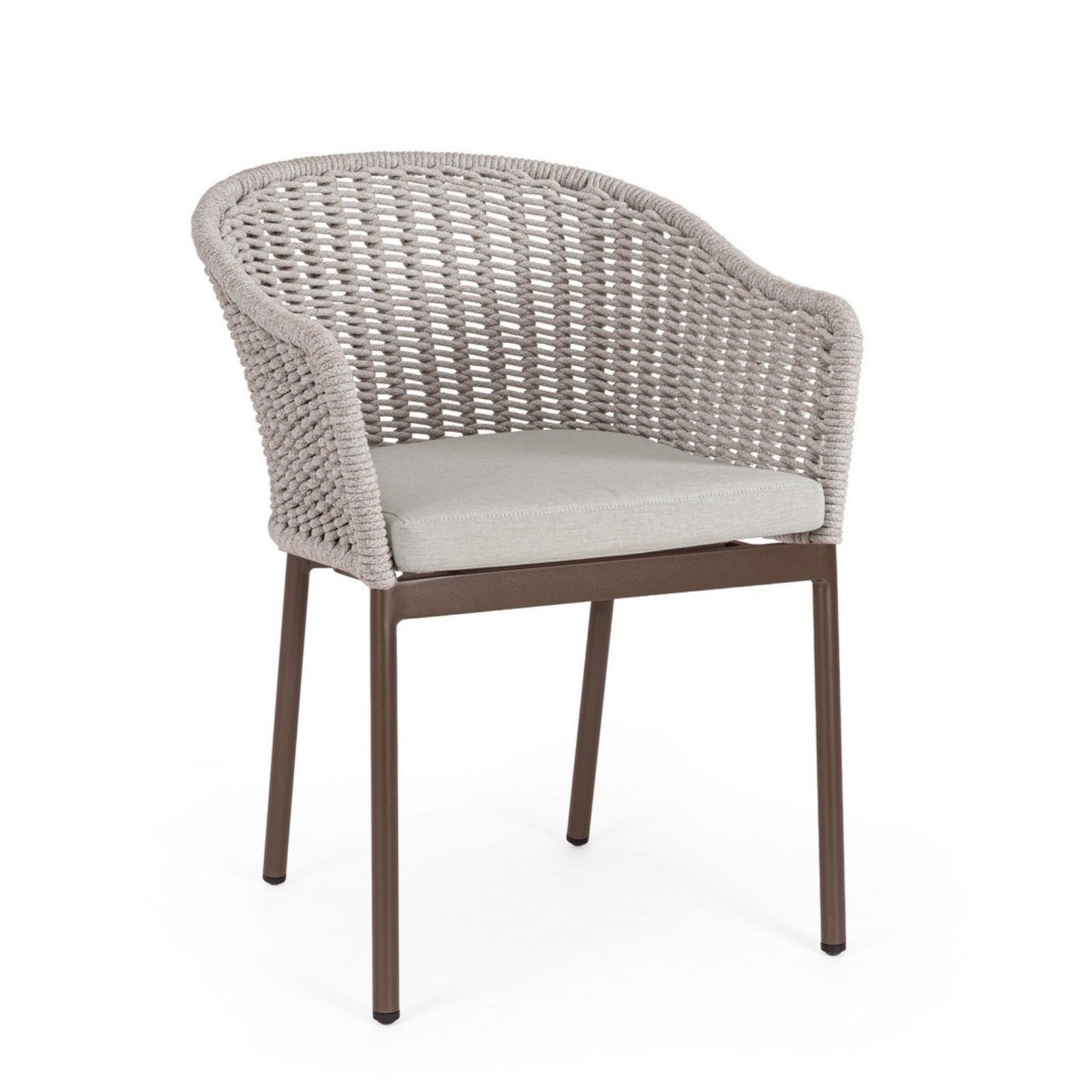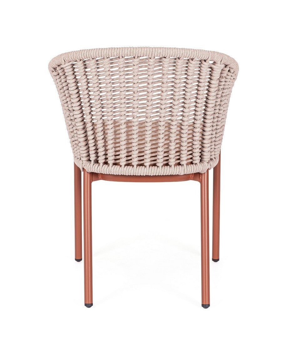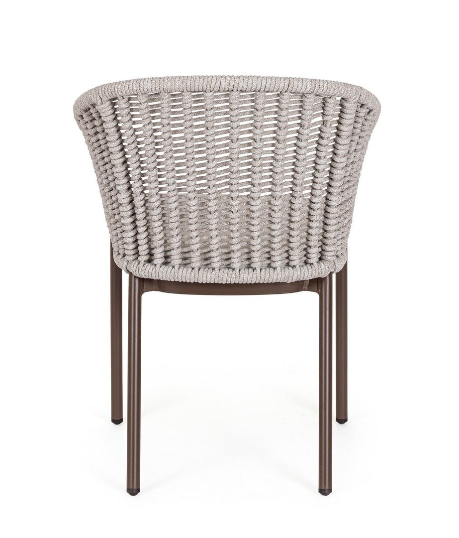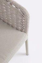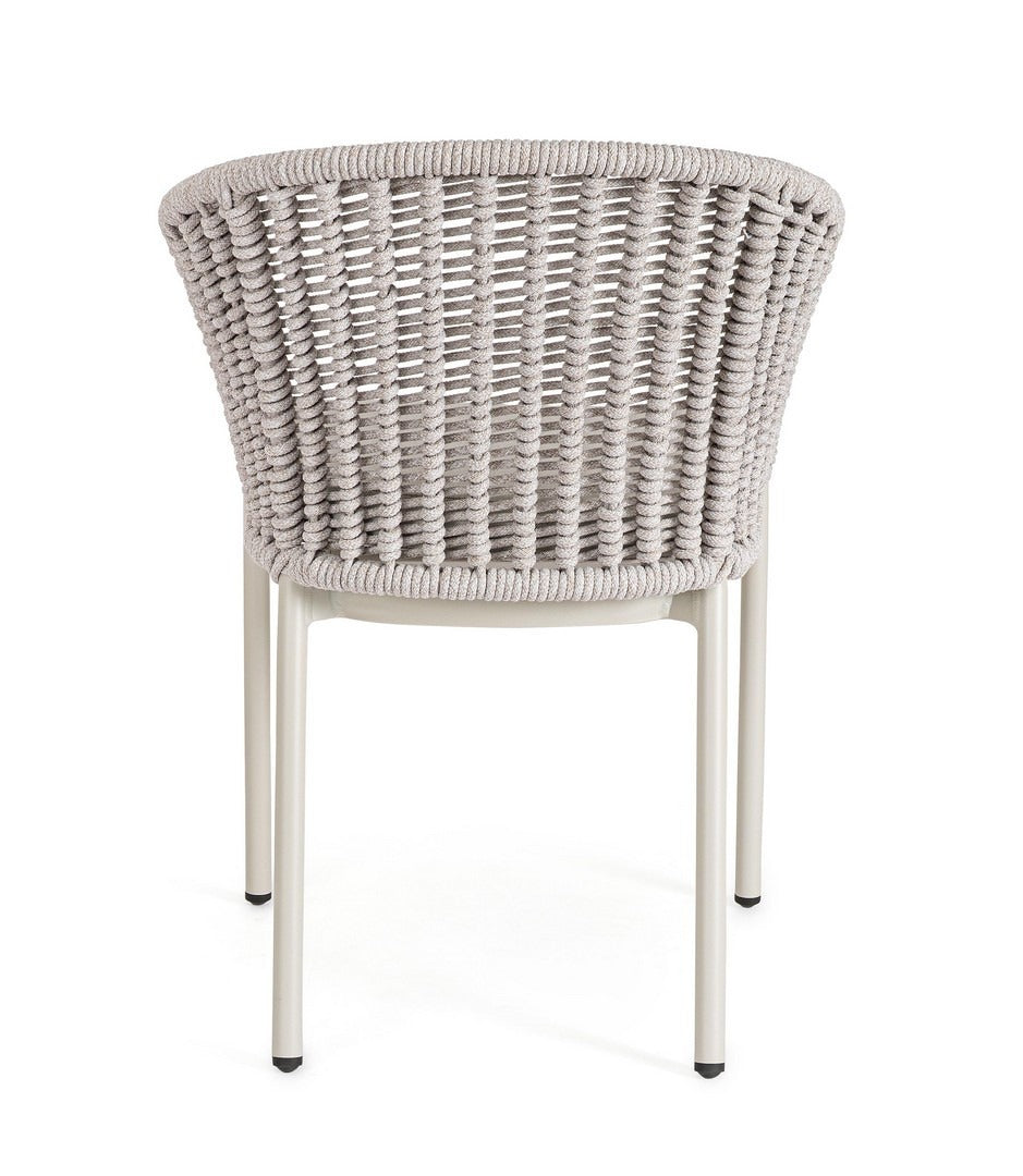 Il suo design equilibrato unisce la leggerezza visiva dell’intreccio in corda alla solidità della struttura in alluminio, creando una seduta accogliente e raffinata.