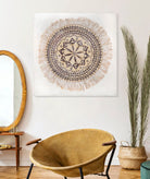 Un dipinto su tela con motivi geometrici e telaio in legno è un'opzione di decorazione d'ambiente che unisce la modernità dei motivi geometrici con la calda naturalezza del telaio in legno.