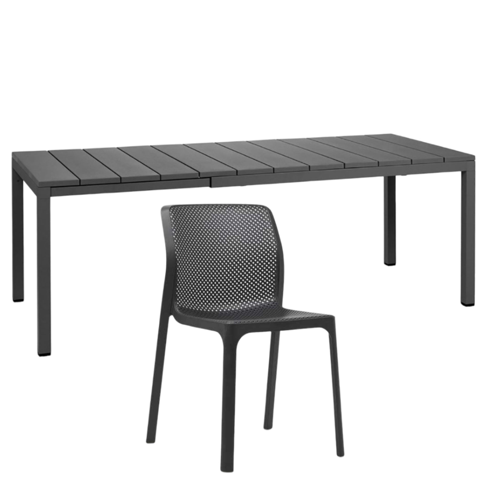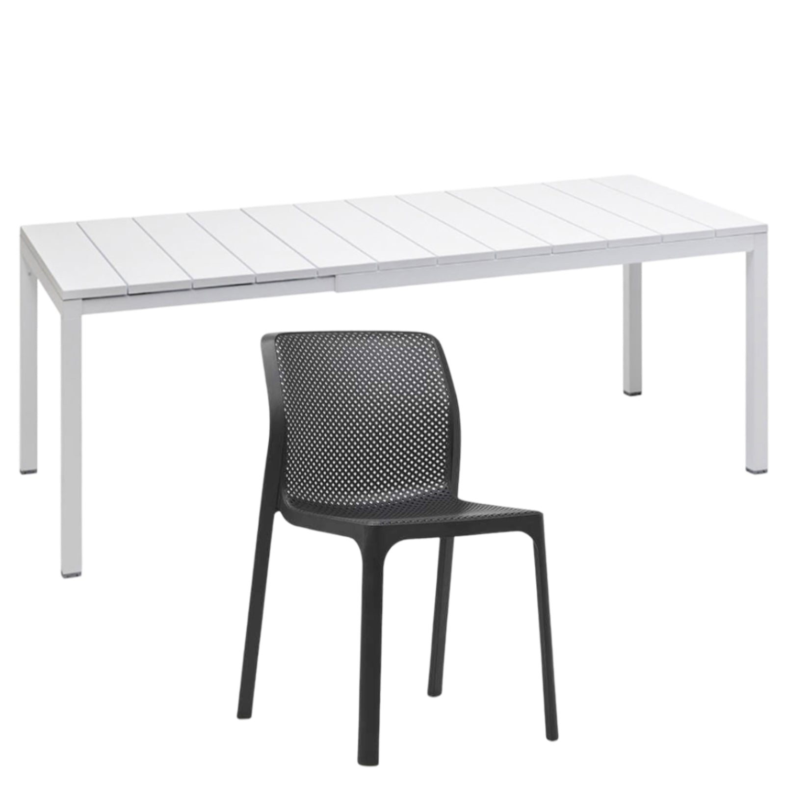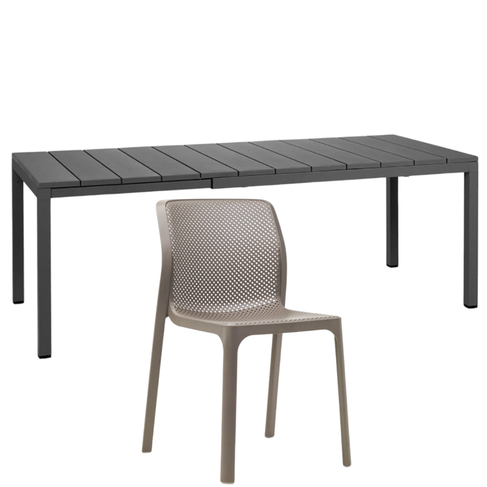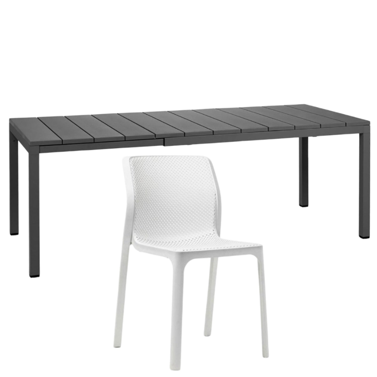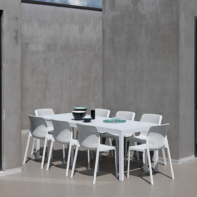 Il set tavolo Rio 140 con 8 sedie Bit griffato Nardi Garden è composto da 1 tavolo Rio da 140 cm allungabile fino a 210 cm e 6 sedie Bit. Il tavolo è realizzato in polipropilene trattato anti-UV e colorato in massa, gambe in alluminio verniciato con piedini regolabili e piano in DurelTOP en pendant cromatico con la struttura.