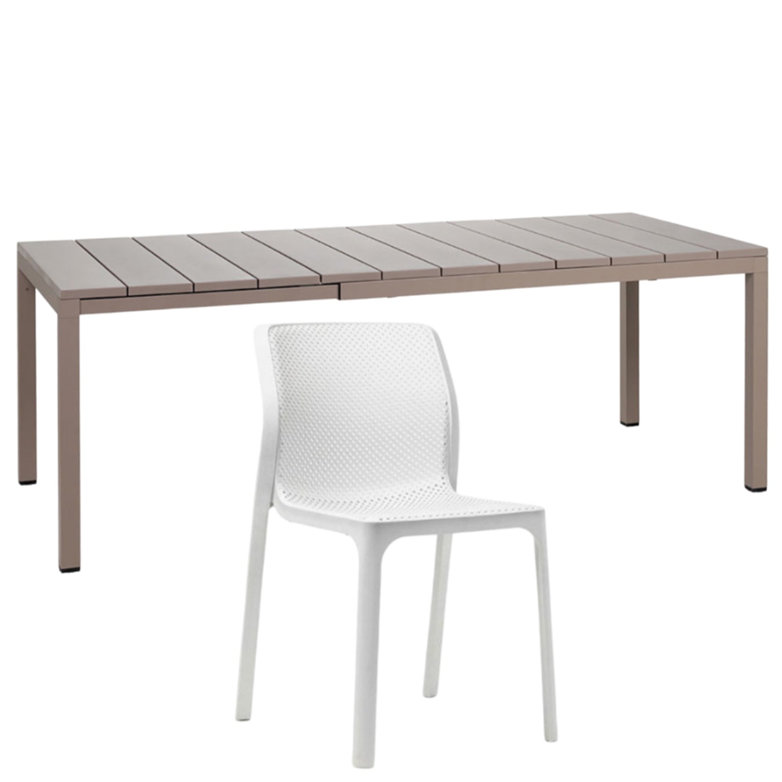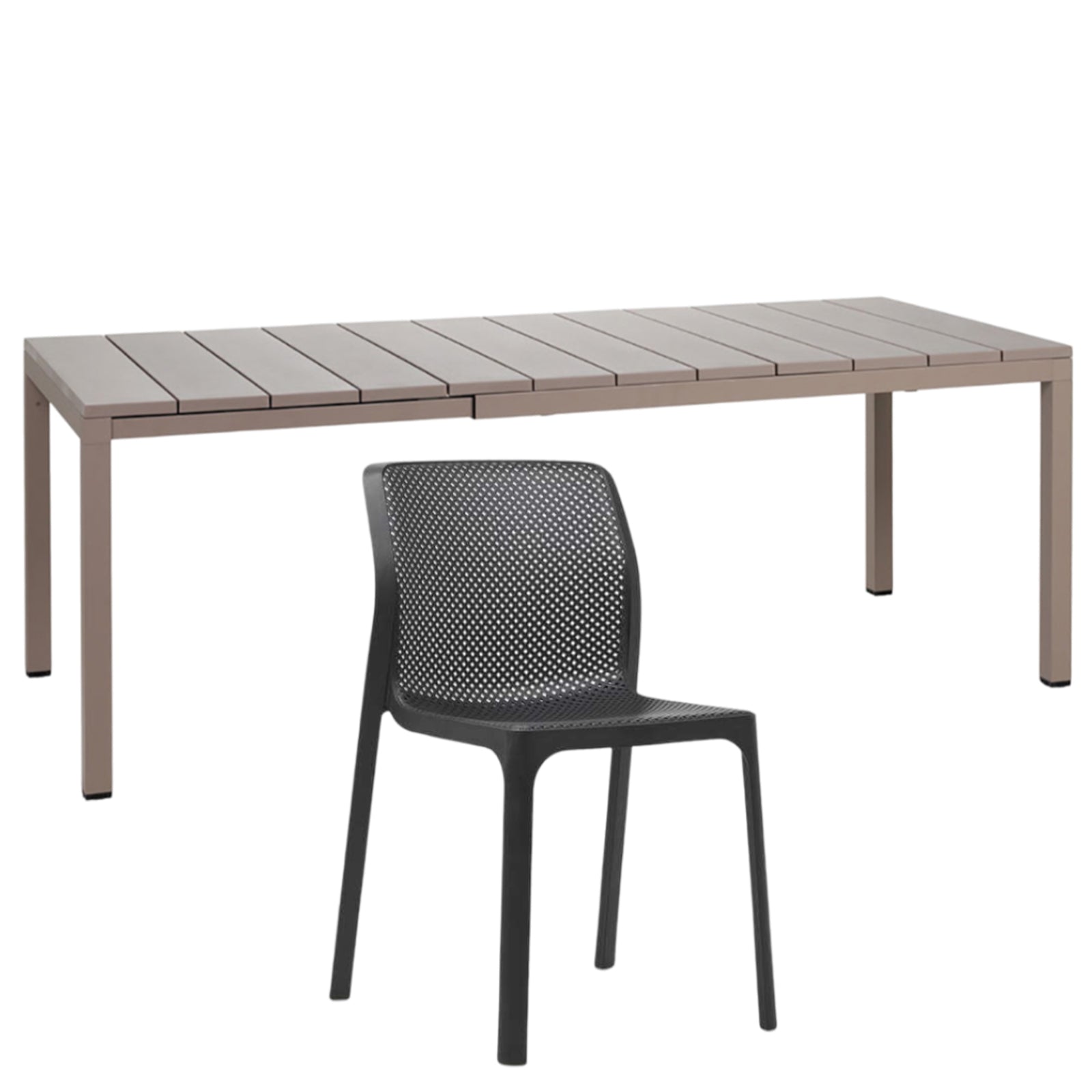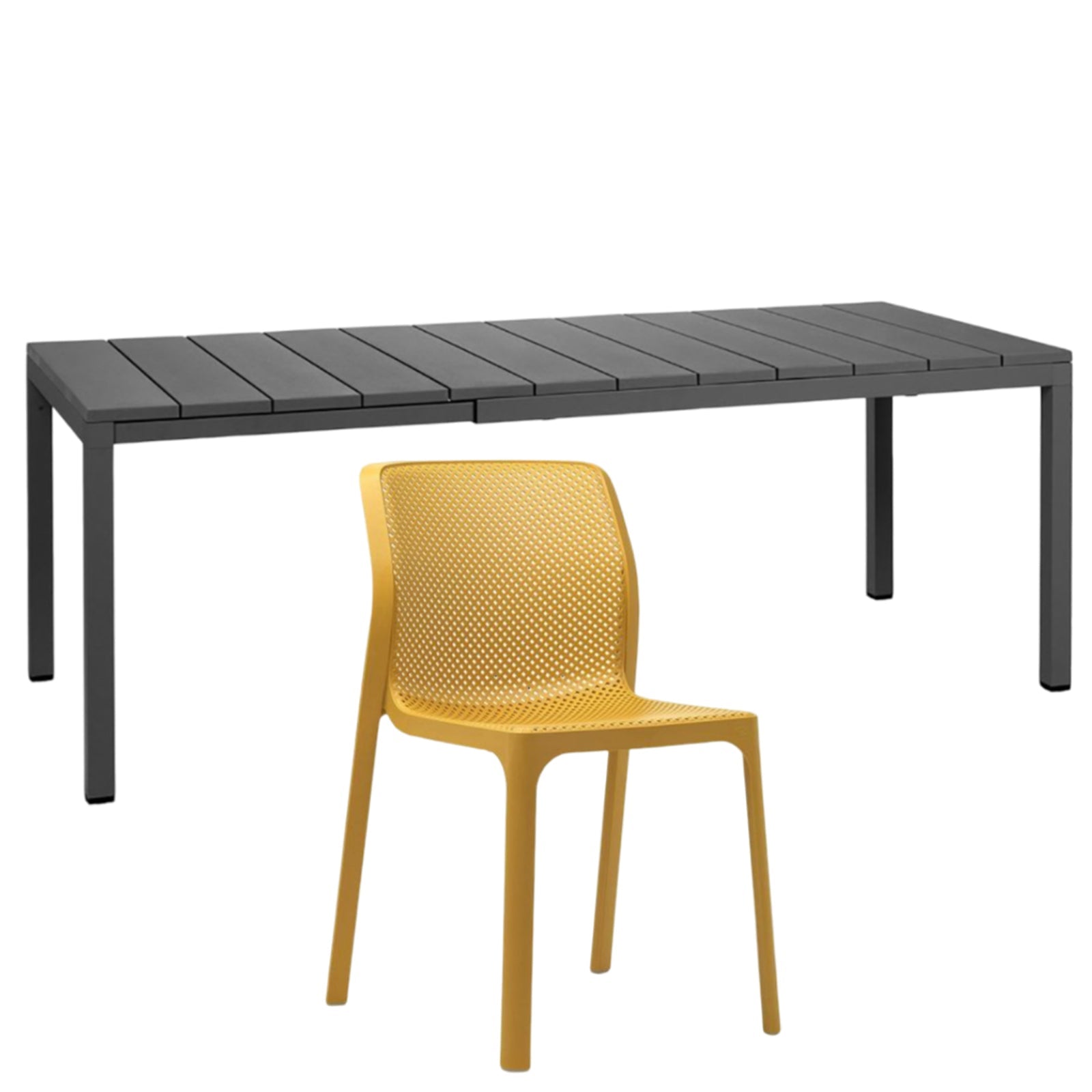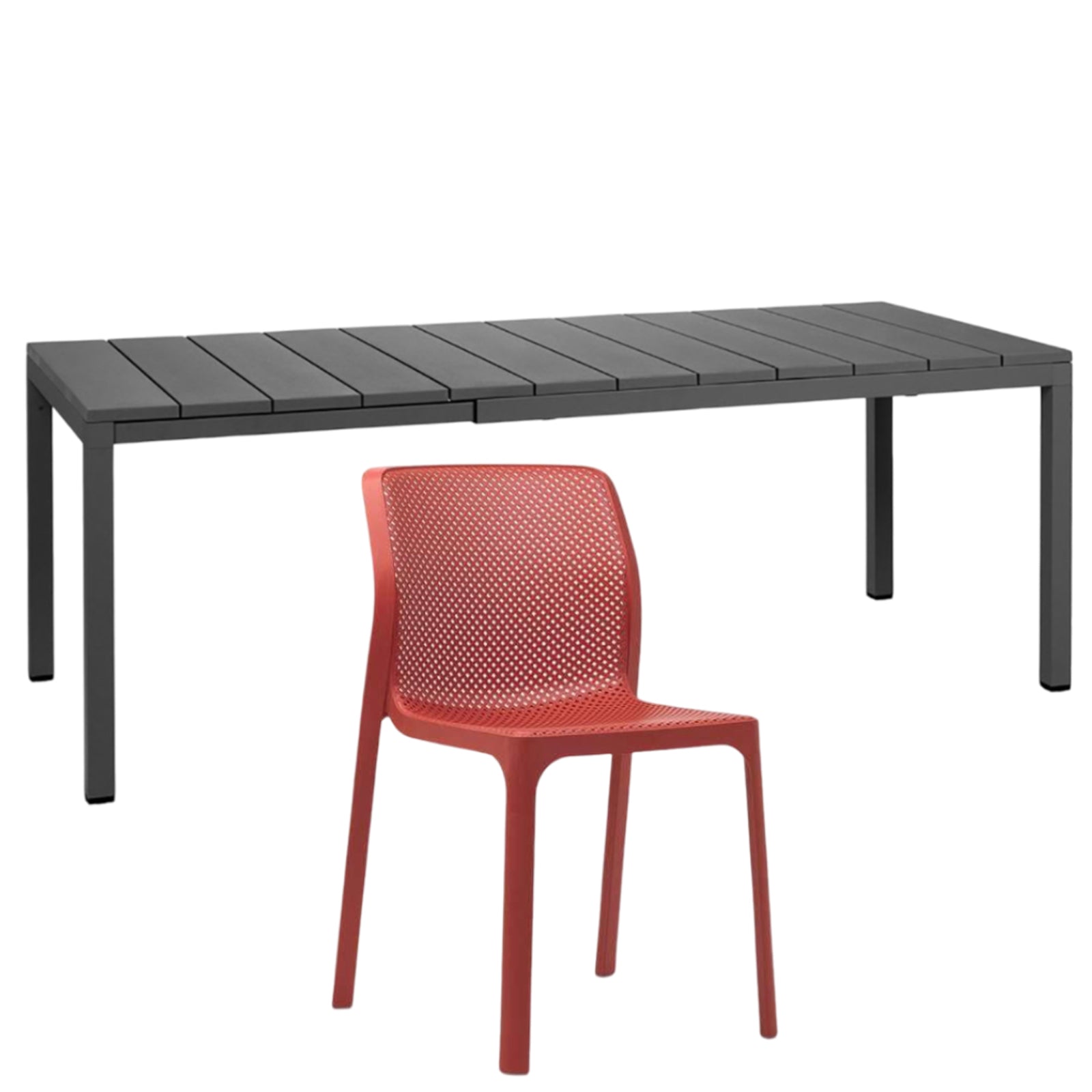 Il set tavolo Rio 140 con 8 sedie Bit griffato Nardi Garden è composto da 1 tavolo Rio da 140 cm allungabile fino a 210 cm e 6 sedie Bit. Il tavolo è realizzato in polipropilene trattato anti-UV e colorato in massa, gambe in alluminio verniciato con piedini regolabili e piano in DurelTOP en pendant cromatico con la struttura.