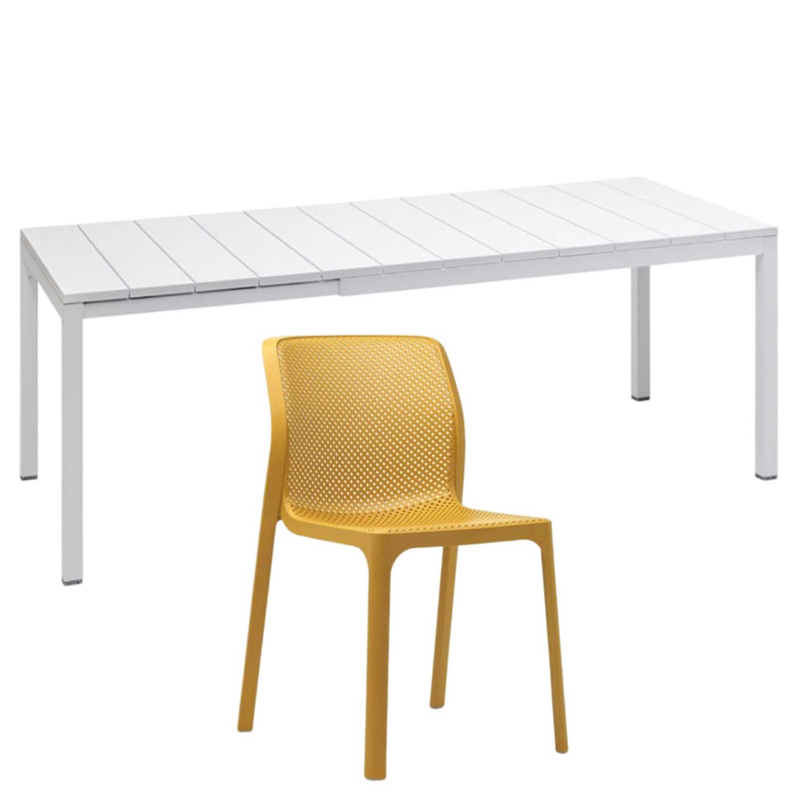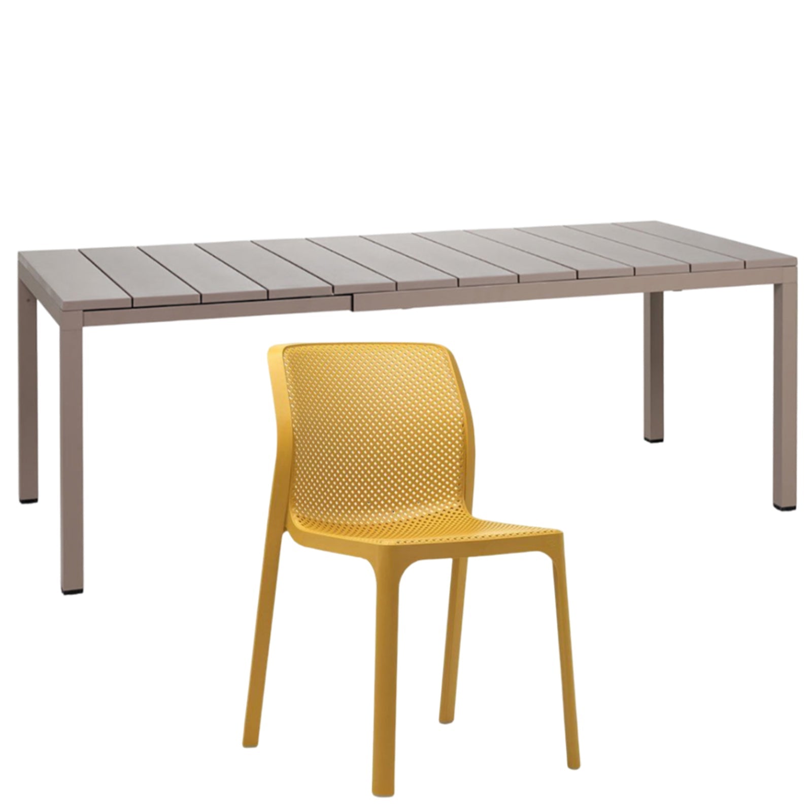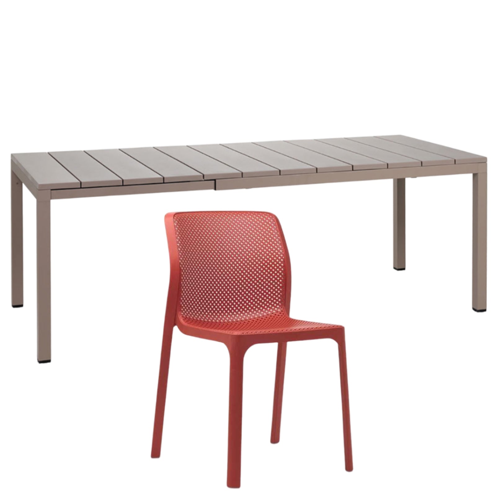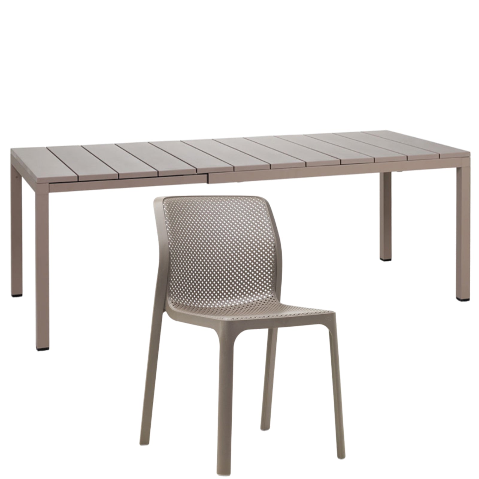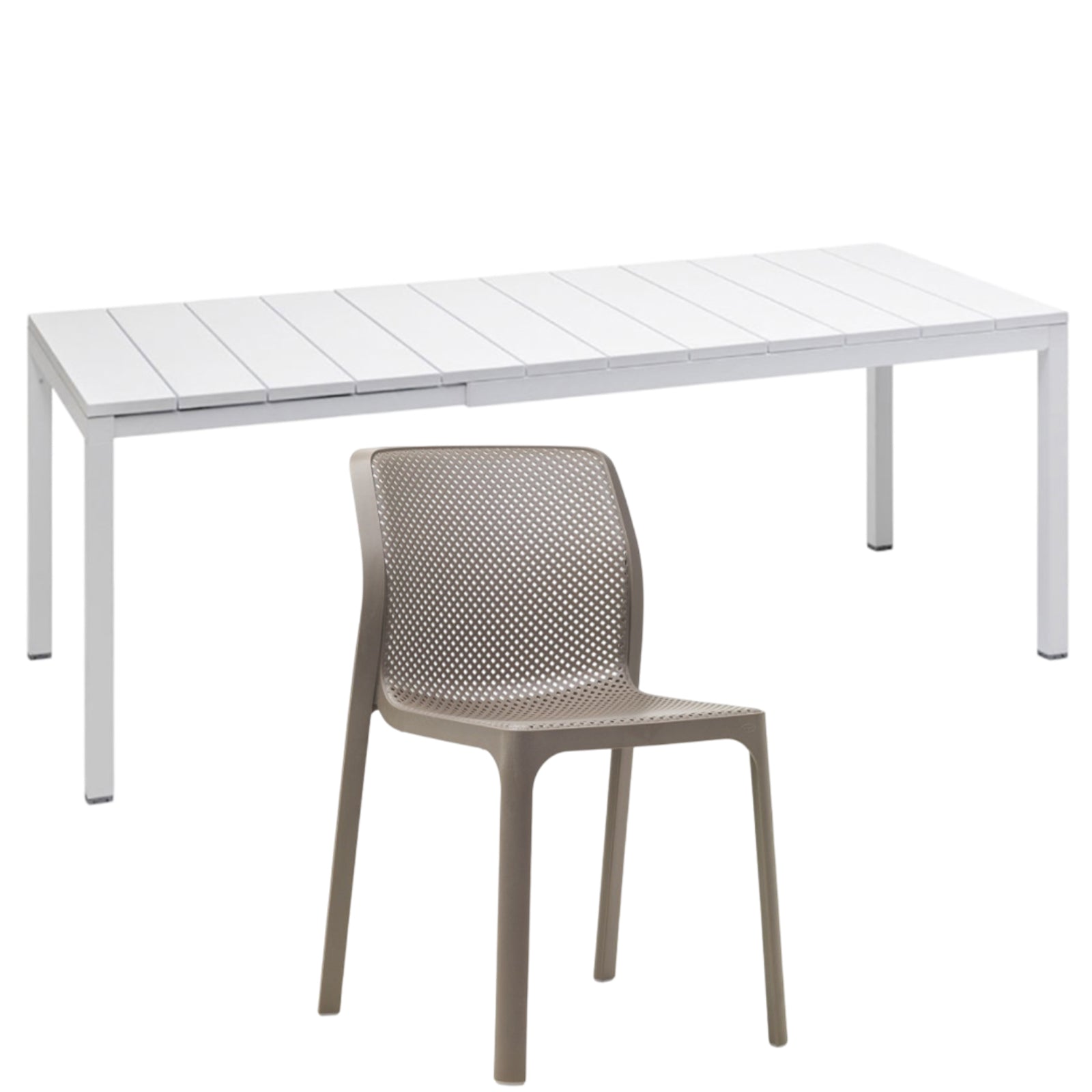 Il set tavolo Rio 140 con 8 sedie Bit griffato Nardi Garden è composto da 1 tavolo Rio da 140 cm allungabile fino a 210 cm e 6 sedie Bit. Il tavolo è realizzato in polipropilene trattato anti-UV e colorato in massa, gambe in alluminio verniciato con piedini regolabili e piano in DurelTOP en pendant cromatico con la struttura.