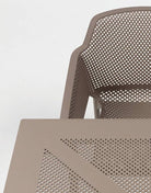 Appositamente studiato per occupare poco spazio, Clip è un tavolo professionale quadrato in resina fiberglass con gamba centrale a quattro razze e piano in DurelTop foto-inciso con un motivo bucherellato.