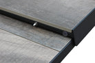 Il piano del tavolo è in gres porcellanato grigio tortora con effetto legno, un materiale di alta qualità che conferisce al tavolo un aspetto elegante e raffinato.