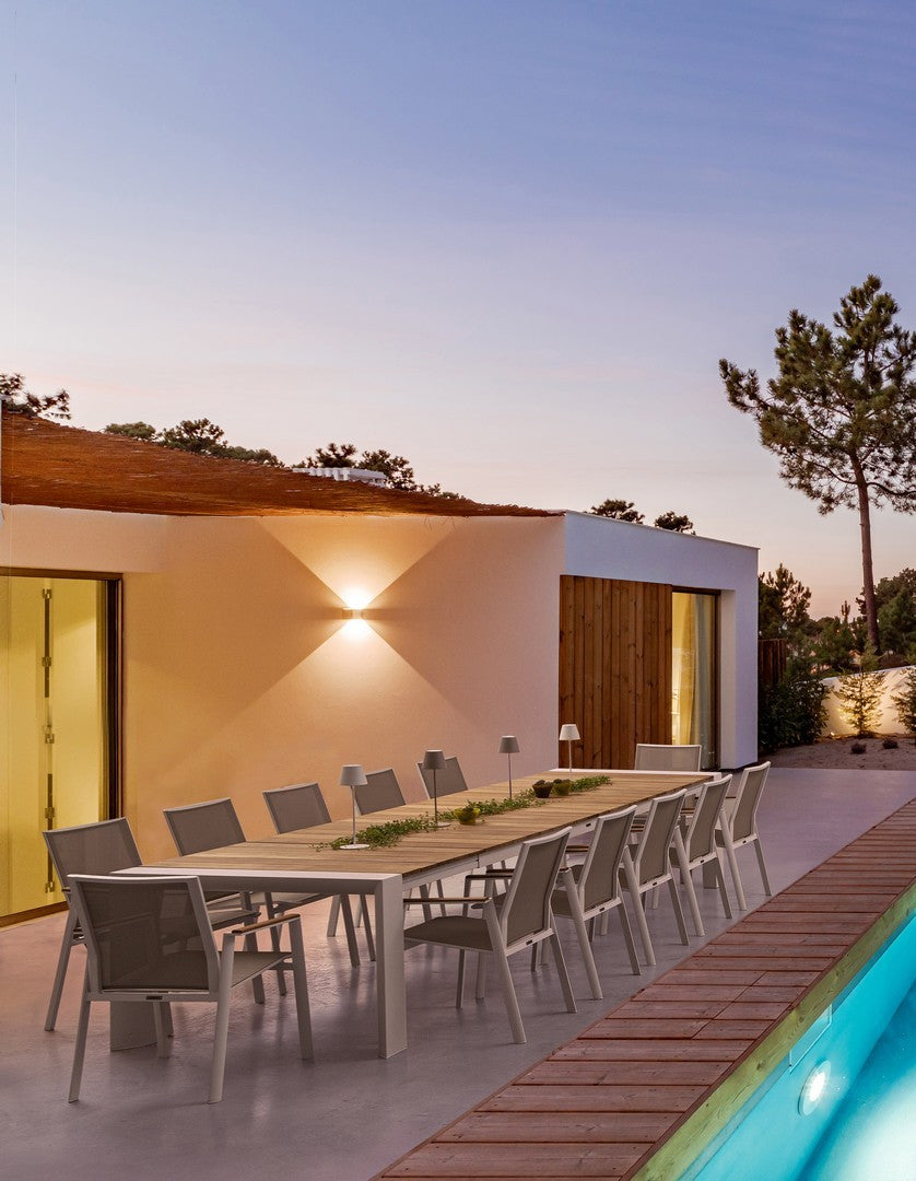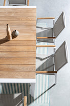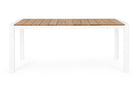 La struttura in alluminio garantisce leggerezza e resistenza, rendendo il tavolo facile da spostare e durevole nel tempo. Il piano in teak aggiunge un tocco naturale e caldo al tavolo, conferendogli anche una resistenza superiore agli agenti atmosferici.