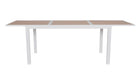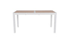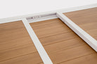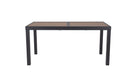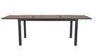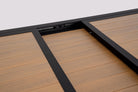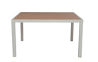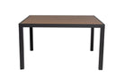Il piano del tavolo, invece, è caratterizzato da un effetto legno che dona un aspetto naturale e caldo, pur mantenendo la praticità e la resistenza dell'alluminio.