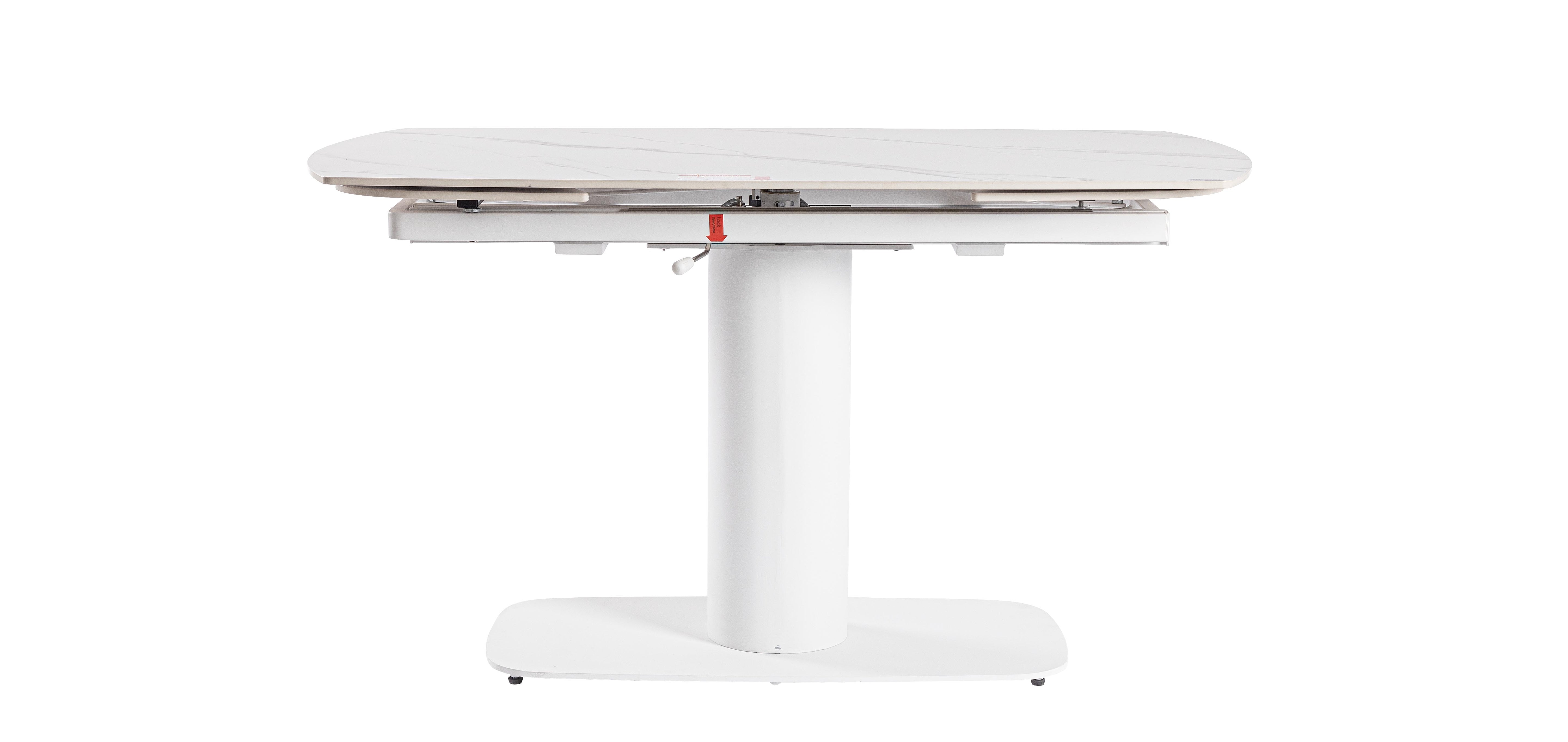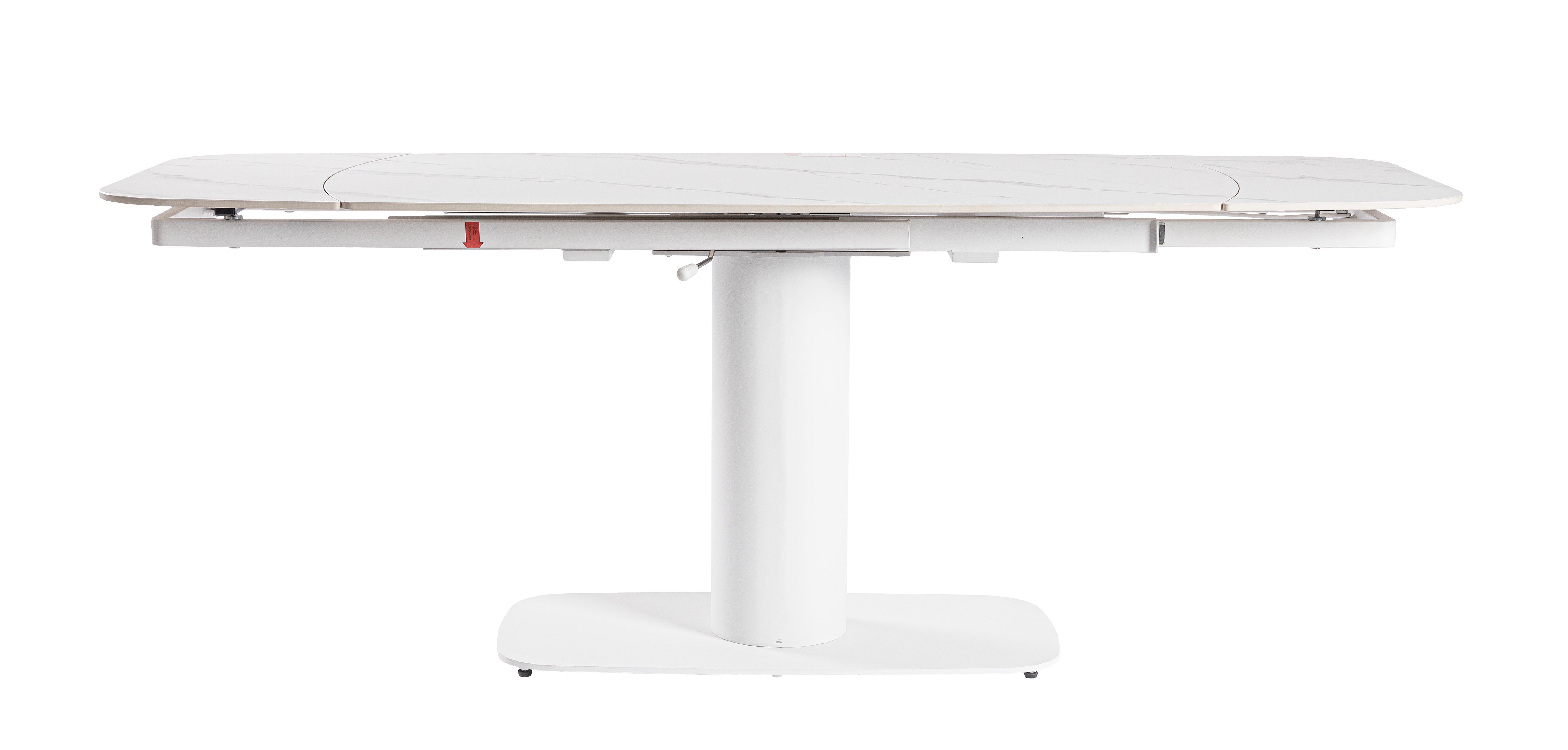 Le gambe del tavolo sono realizzate in acciaio verniciato a polvere epossidica, conferendo resistenza e stabilità alla struttura. Il piano del tavolo è realizzato in ceramica con uno spessore di 5mm, supportato da un sottostrato in vetro temperato da 8mm, che aggiunge solidità e sicurezza alla superficie.