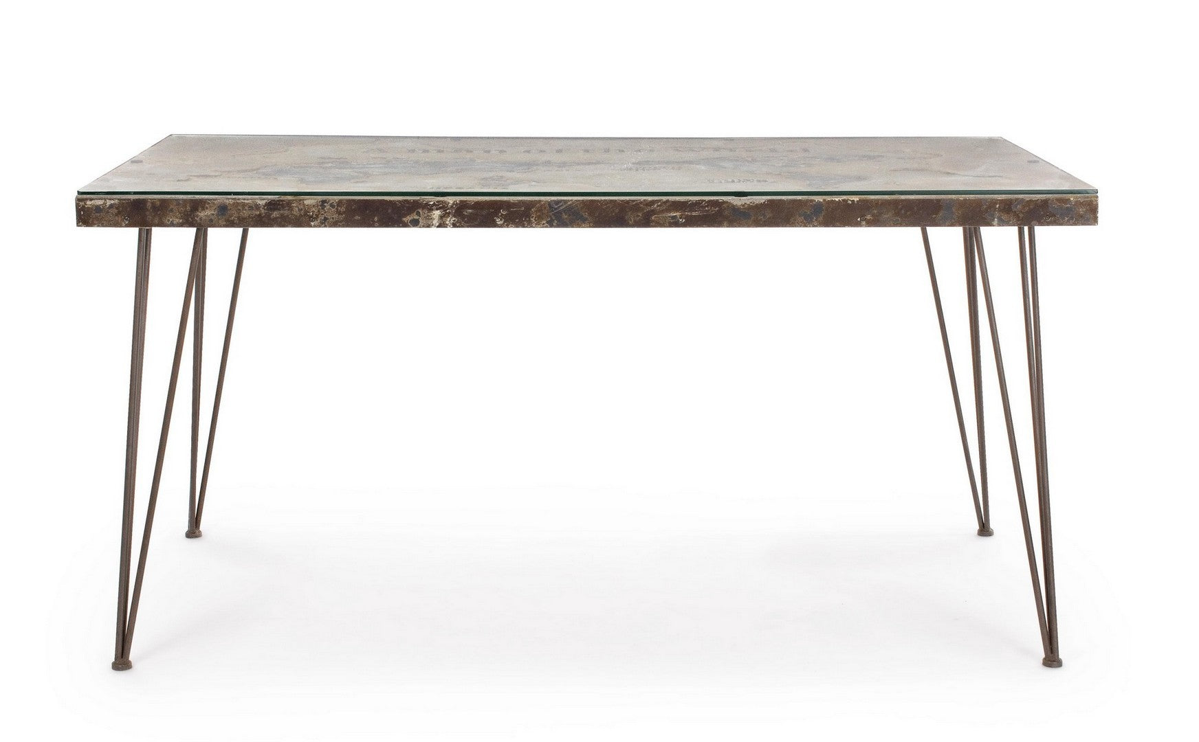 Tavolo Atlantide rettangolare, con struttura in acciaio anticato, piano in vetro e mdf da 160 x 90 cm