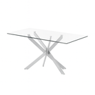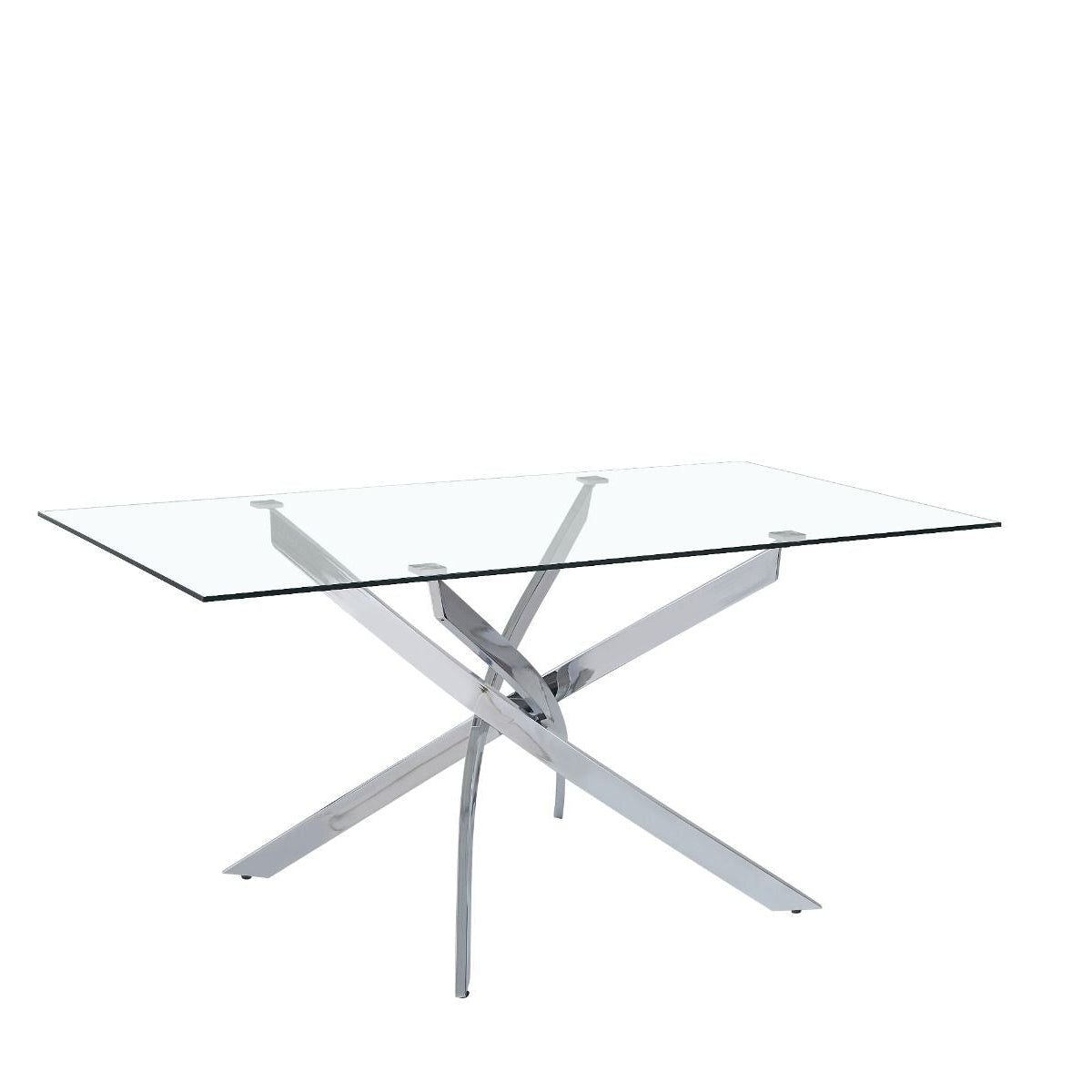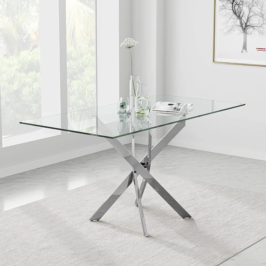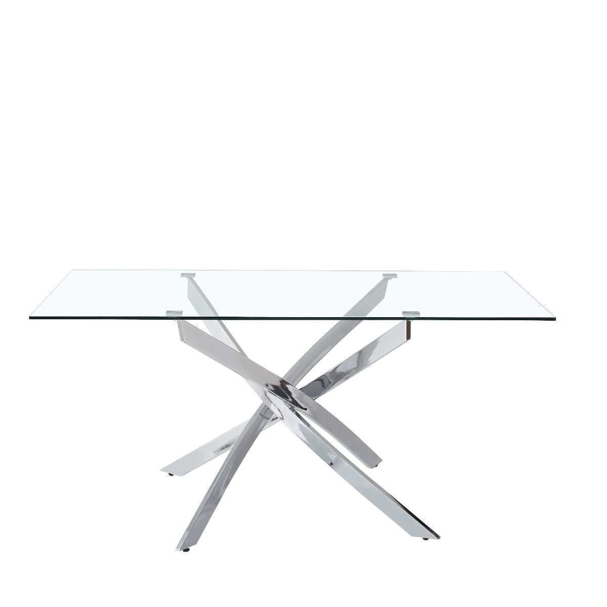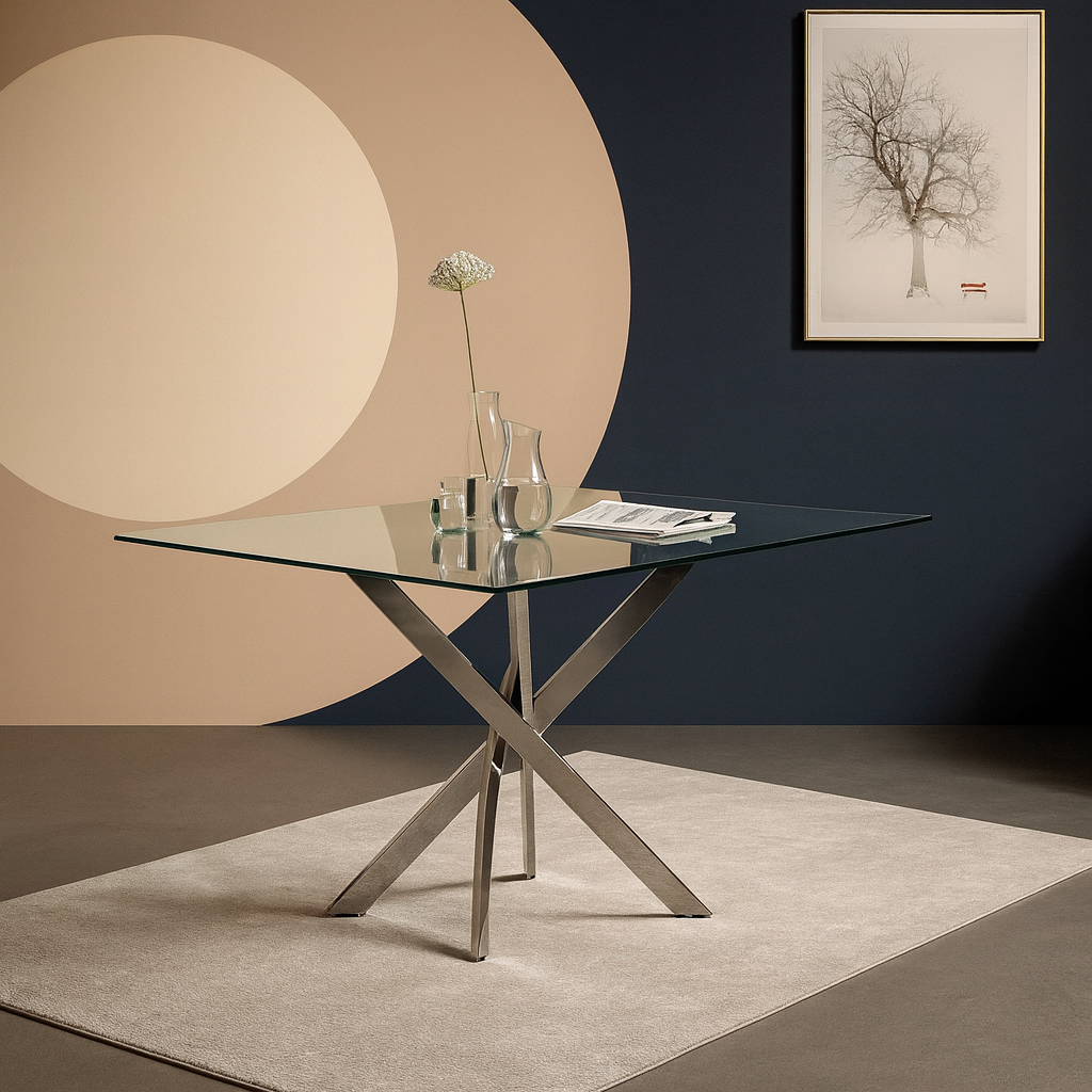 Tavolo "Terra" con gambe incrociate in metallo cromato e piano in vetro temperato, design moderno per arredo interno