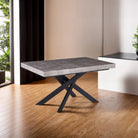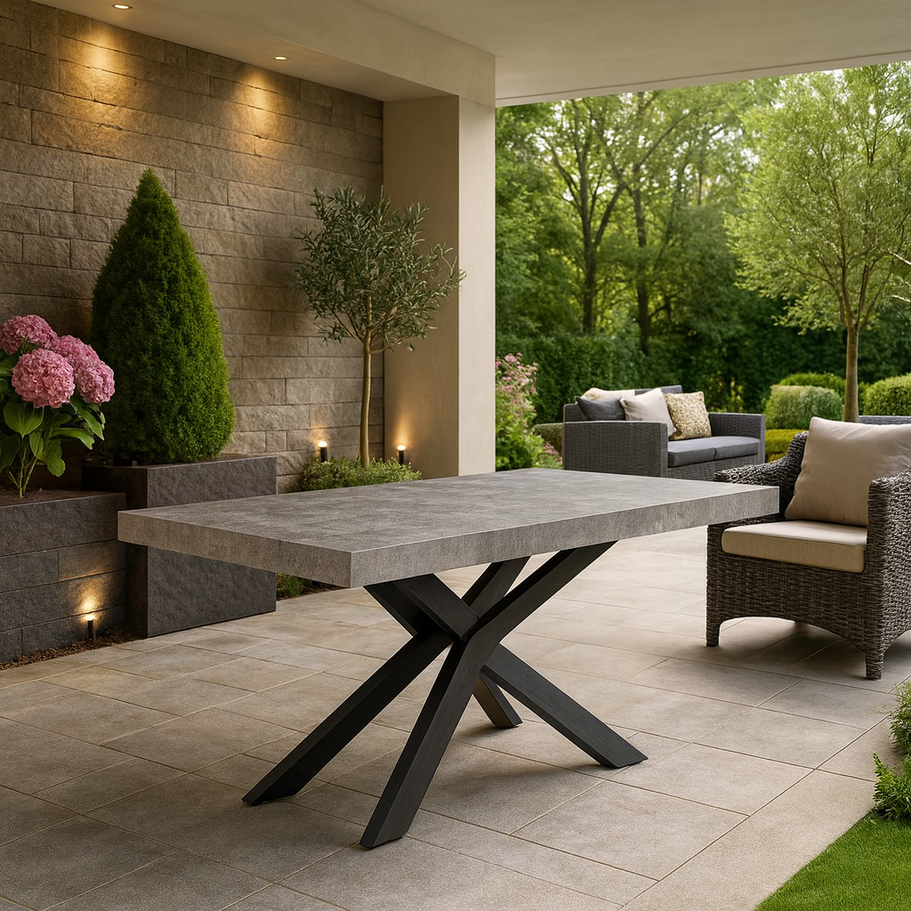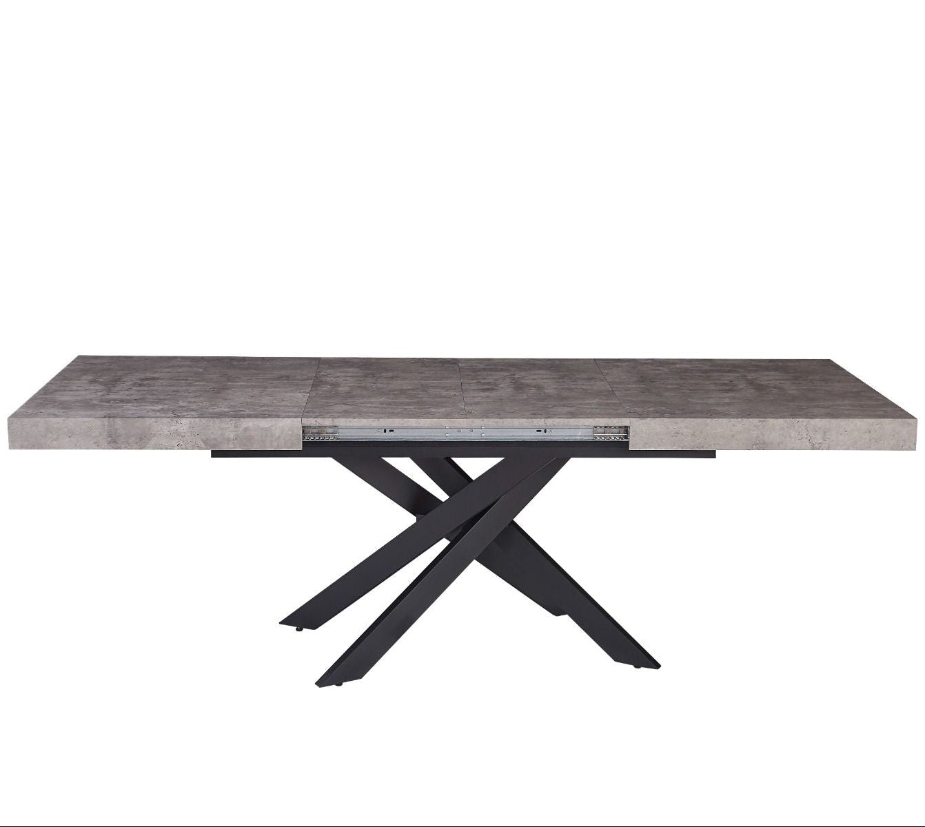 Tavolo "Trappist" con gambe incrociate e piano in finitura cemento beton, design moderno, per arredo interno