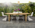 Tavolo per esterni realizzato interamente in legno Teak riciclato color naturale.