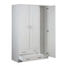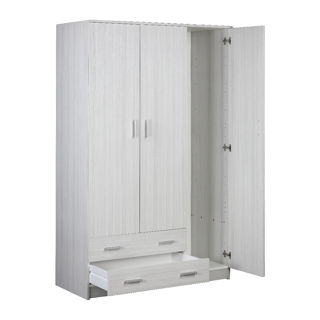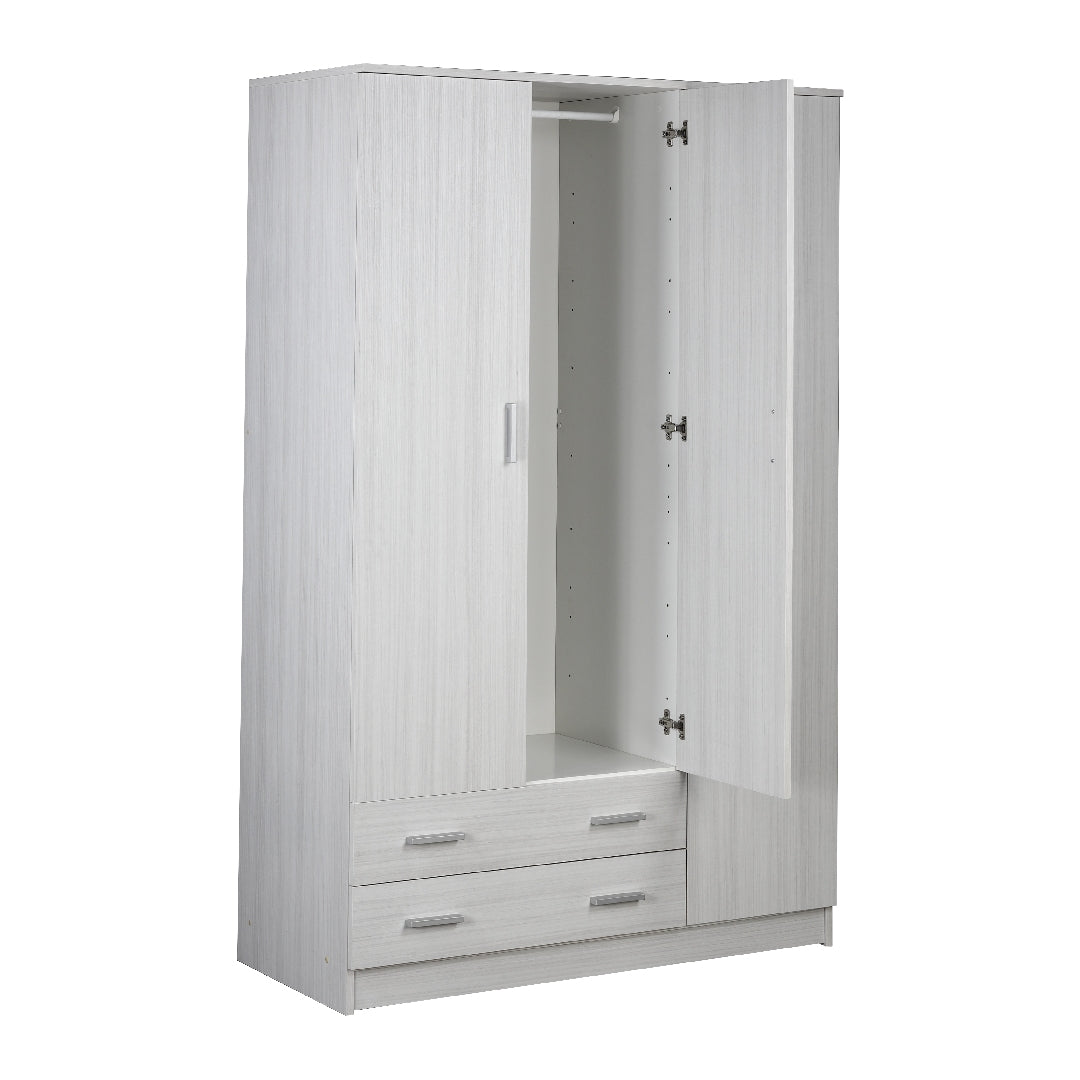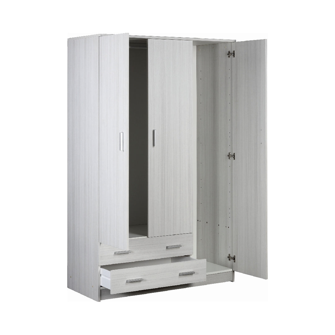 Le tre ante permettono di organizzare abiti, biancheria e accessori in modo ordinato, mentre i due cassetti aggiungono un ulteriore livello di funzionalità.