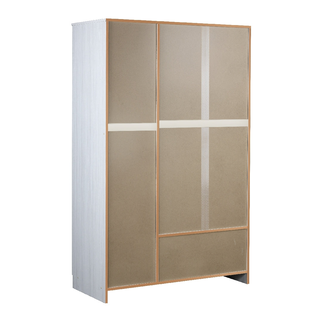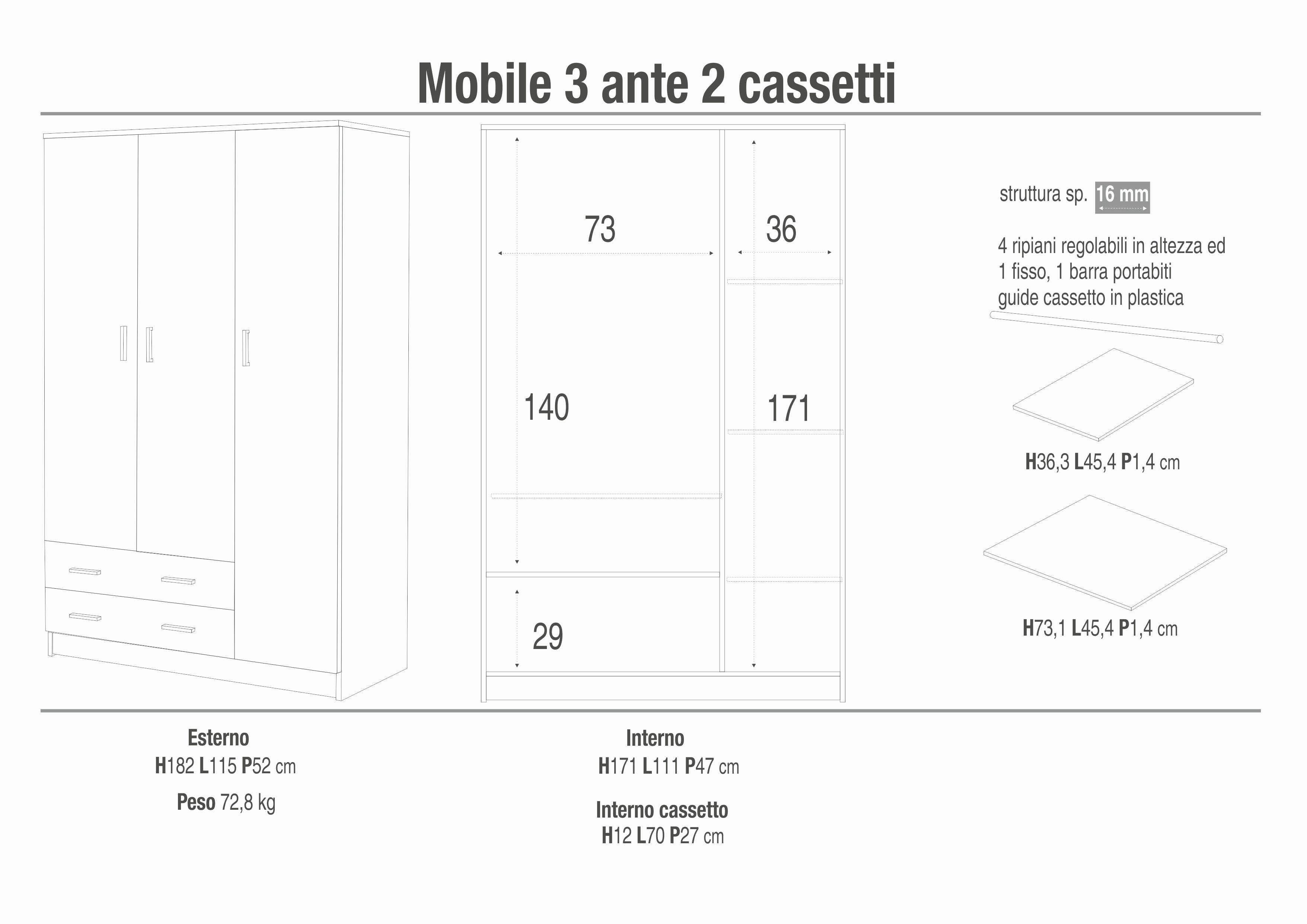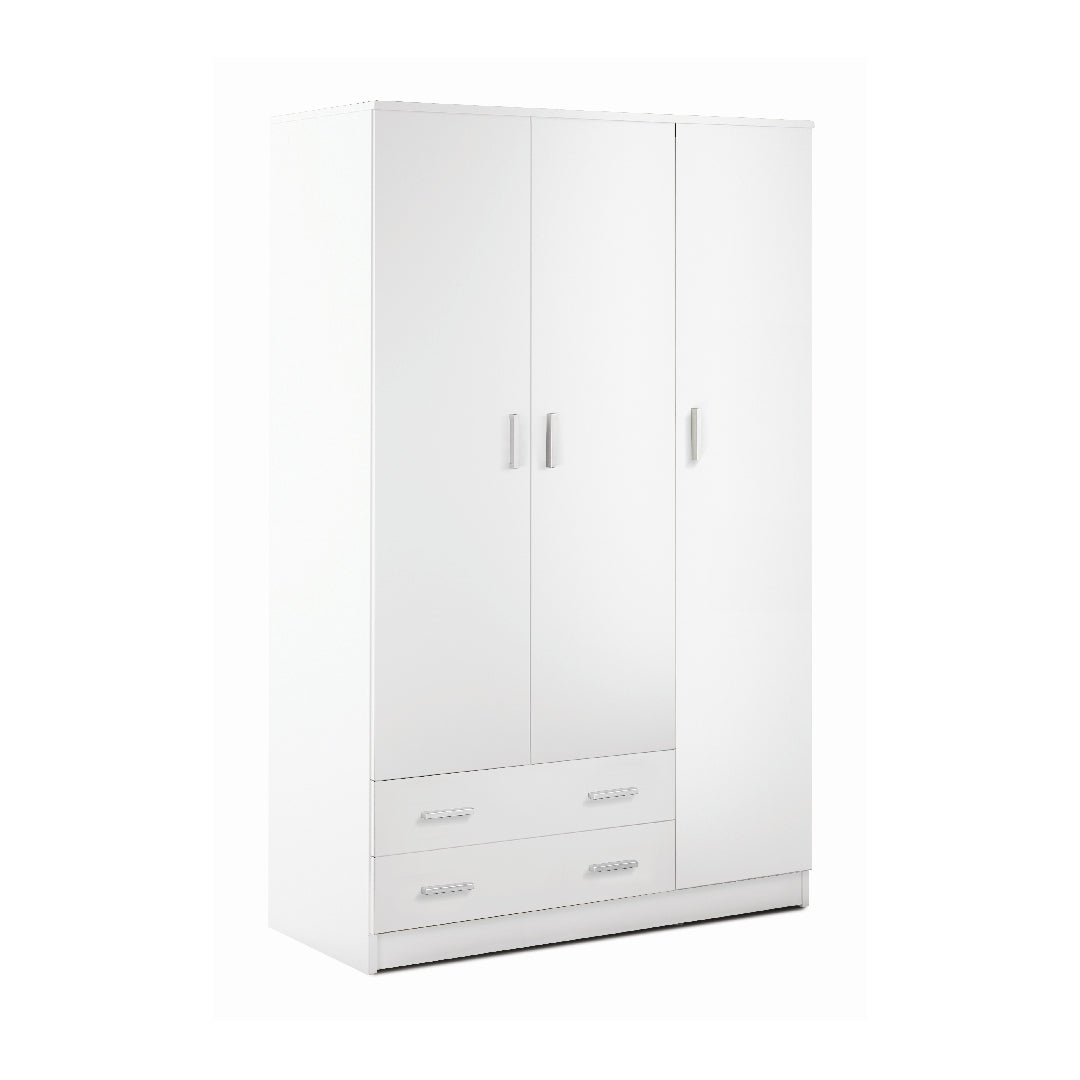 Le tre ante permettono di organizzare abiti, biancheria e accessori in modo ordinato, mentre i due cassetti aggiungono un ulteriore livello di funzionalità.