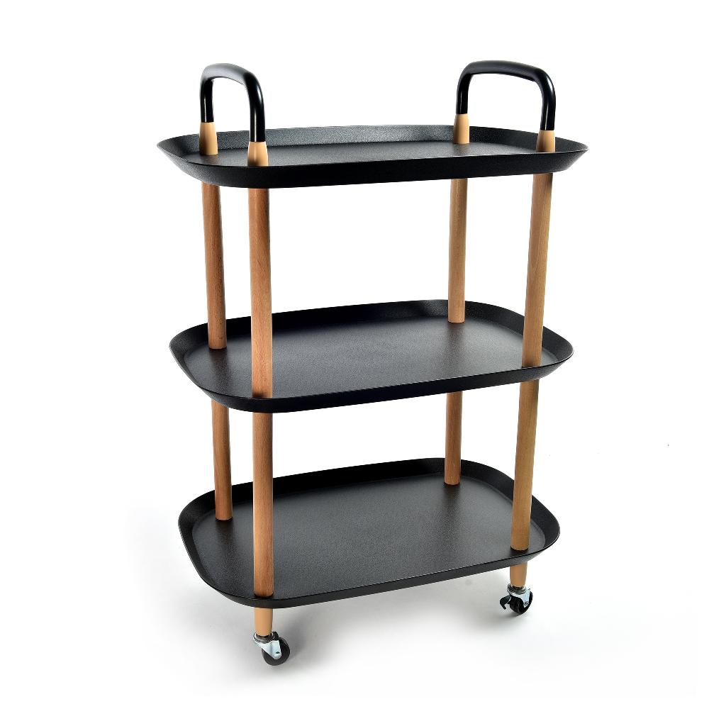 Il carrello con 3 ripiani in plastica nera e struttura in legno è un'ottima soluzione per organizzare e trasportare oggetti in esterni.