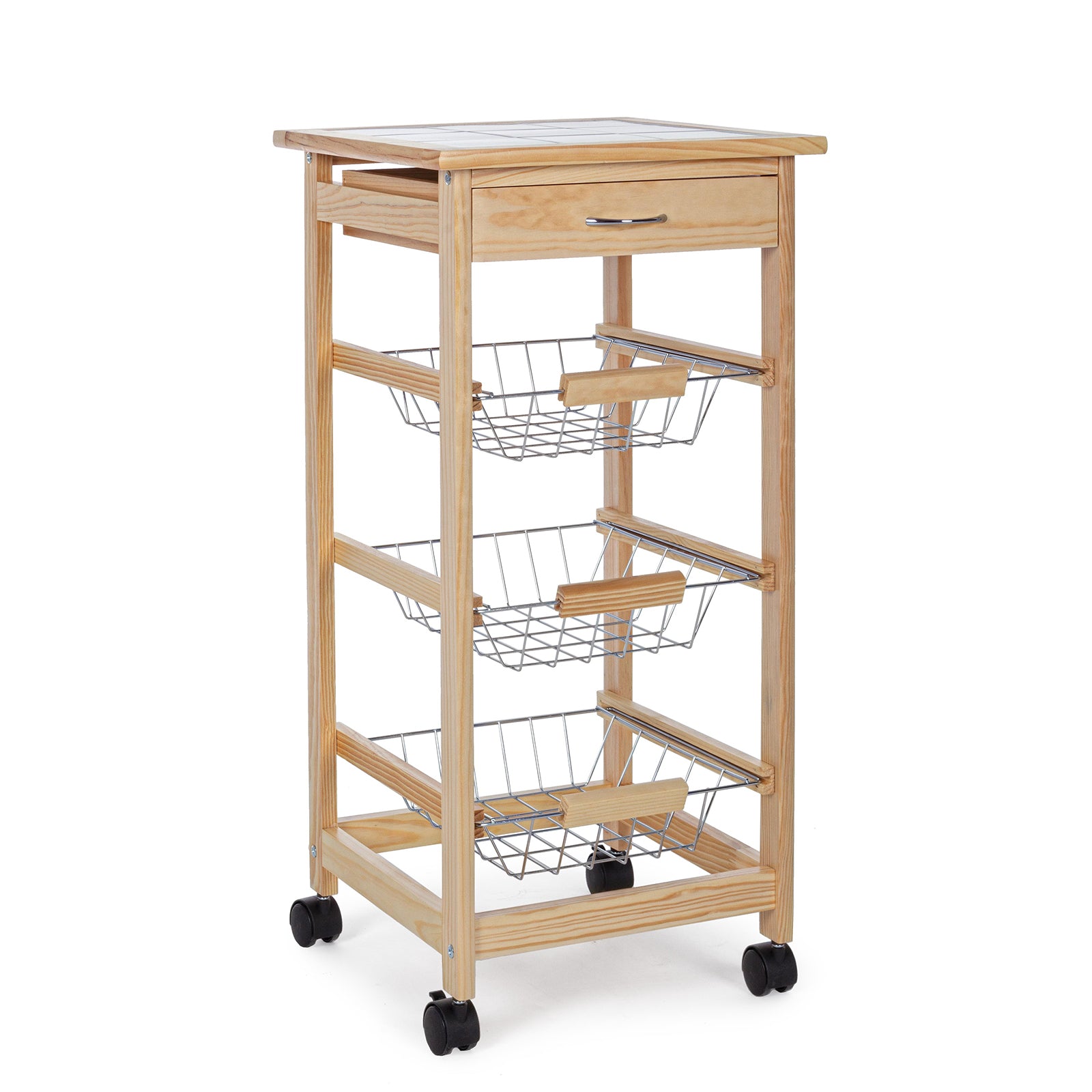 Carrello con ruote da cucina in Legno con 1 cassetto e 3 ceste portafrutta in metallo, porta pane e tagliere
