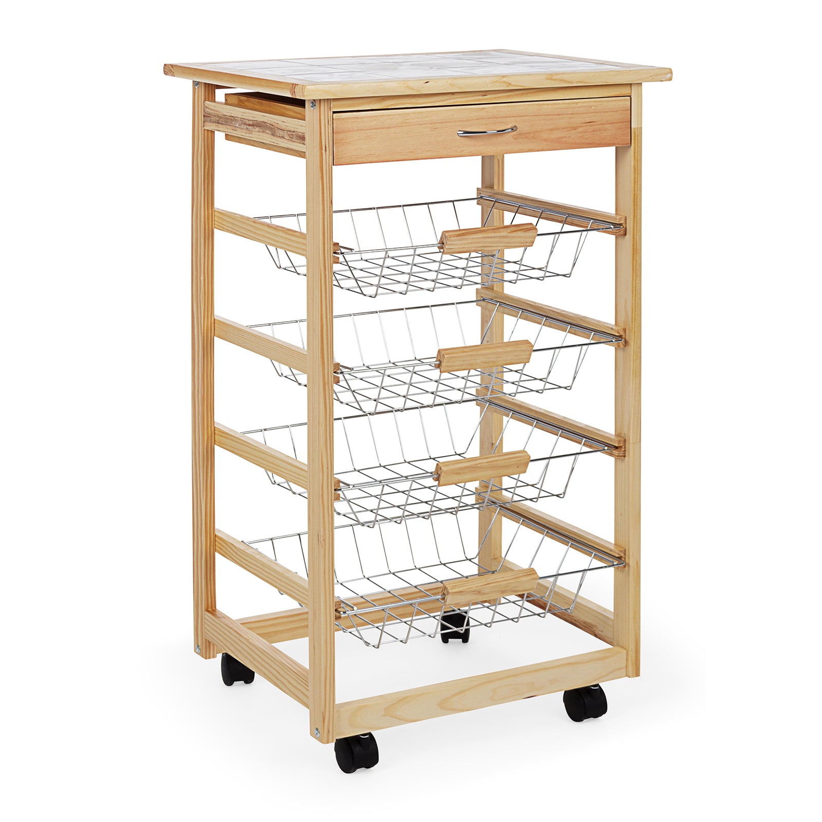 Carrello con ruote da cucina in Legno con 1 cassetto e 4 ceste portafrutta in metallo, porta pane e tagliere
