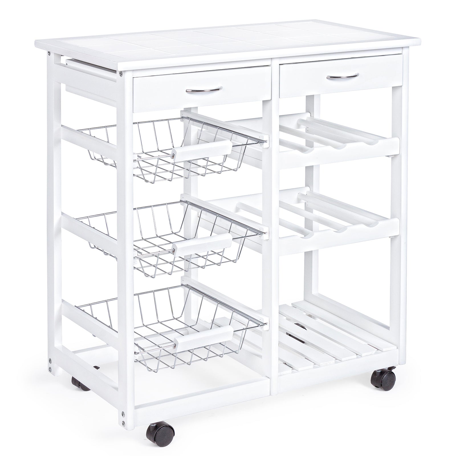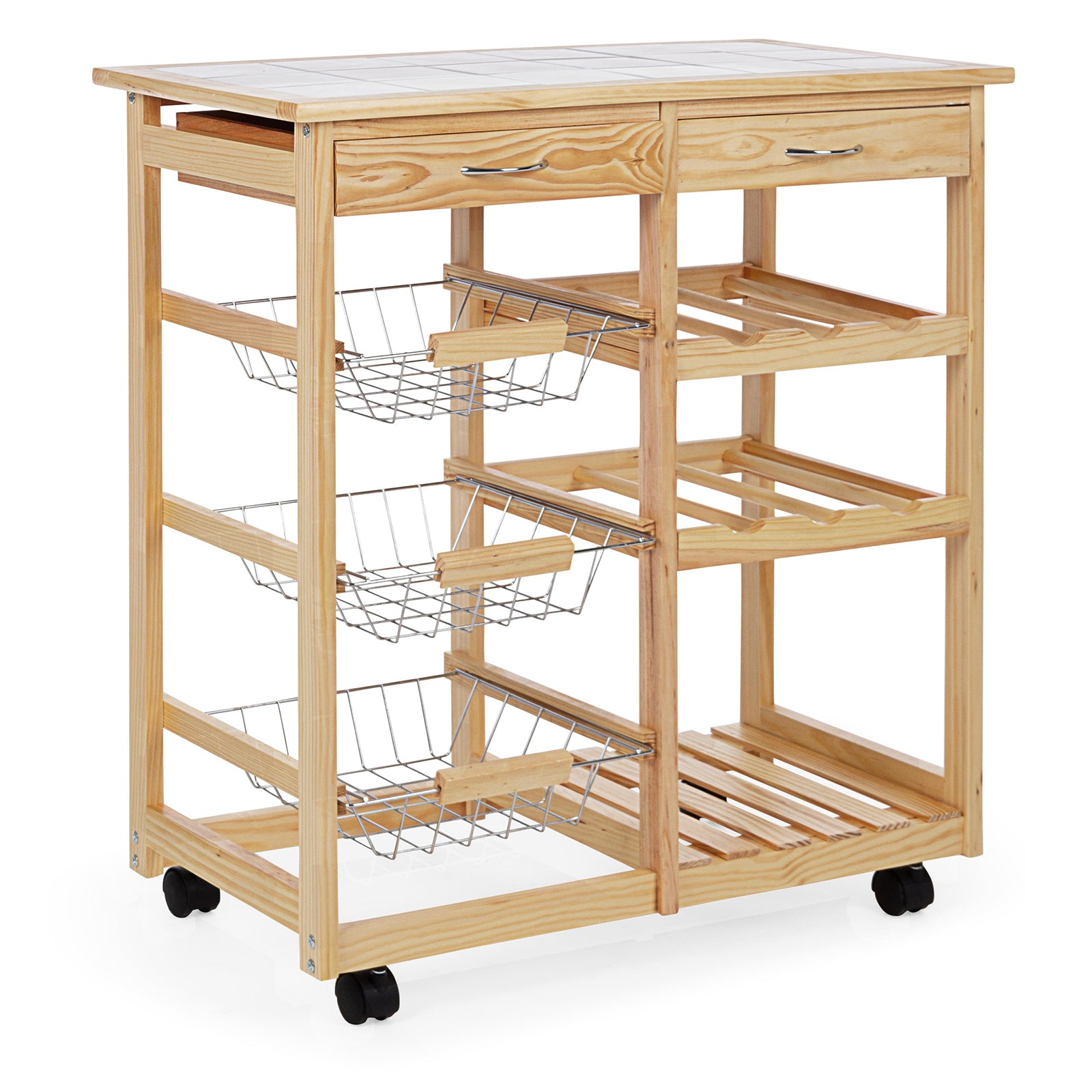 Carrello con ruote da cucina in Legno con 2 cassetti e 3 ceste portafrutta in metallo, porta pane e tagliere