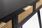 I cassetti si inseriscono perfettamente nel design complessivo, con meccanismi fluidi che permettono un'apertura e chiusura agevoli, mantenendo il profilo sobrio e lineare della consolle.