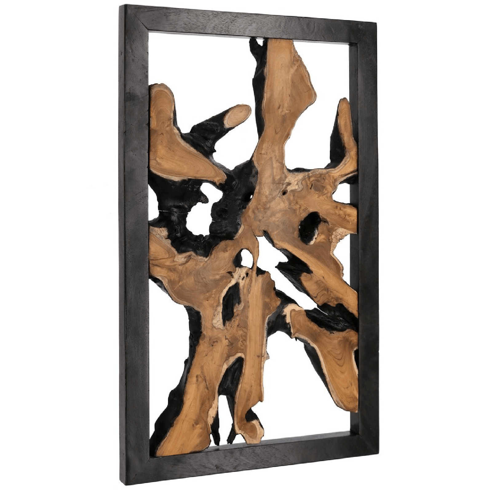 La decorazione murale "Sherwood" è un'aggiunta straordinaria per arricchire l'ambiente della tua casa, portando con sé la bellezza e l'autenticità della natura attraverso le radici di teak originali e la cornice in legno teak.