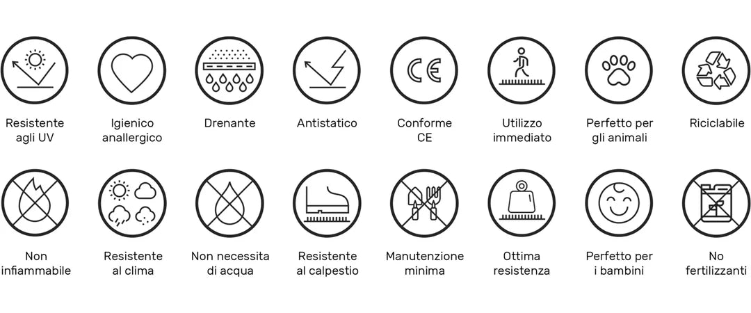 L'erbetta è resistente alle interperie, Conforme alle normative CE, Riciclabile, antistatica, non infiammabile, drenante, resistente al calpestio e delicata al tatto dei tuoi cuccioli.