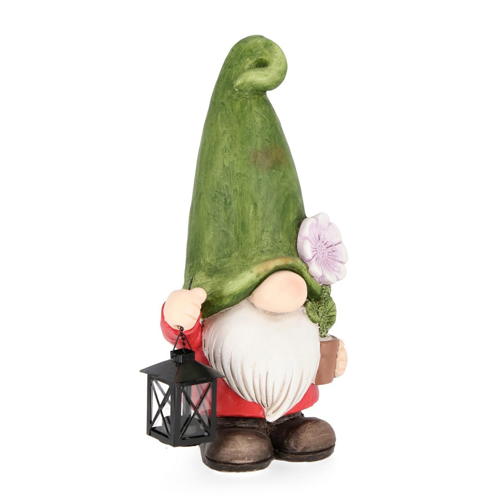 Il fiore nella mano del gnomo aggiunge un tocco di colore e natura, mentre la lanterna contribuisce a creare un'atmosfera accogliente e calda durante le serate all'aperto.