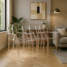 La sedia in policarbonato trasparente, combina le linee di un design classico con l'uso di materiali industriali per la realizzazione.