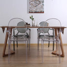 La sedia in policarbonato trasparente, combina le linee di un design classico con l'uso di materiali industriali per la realizzazione.
