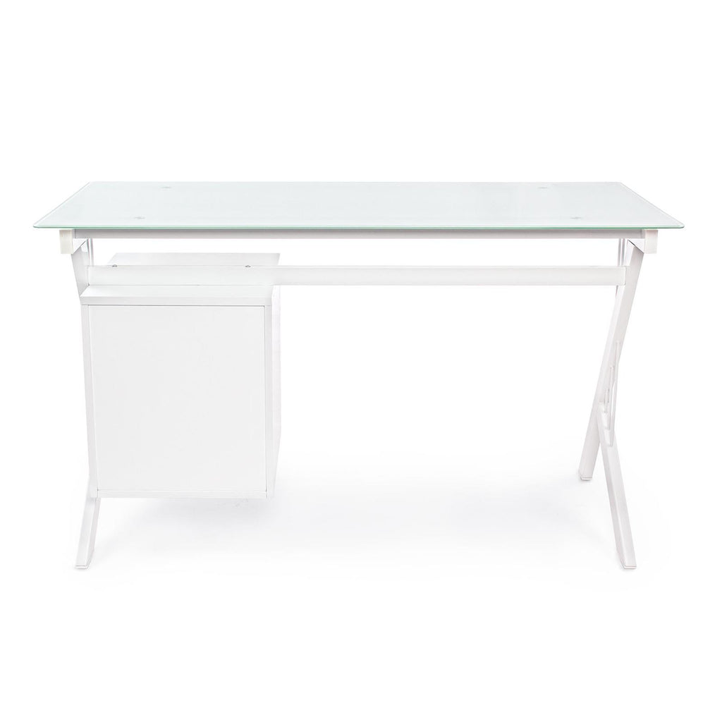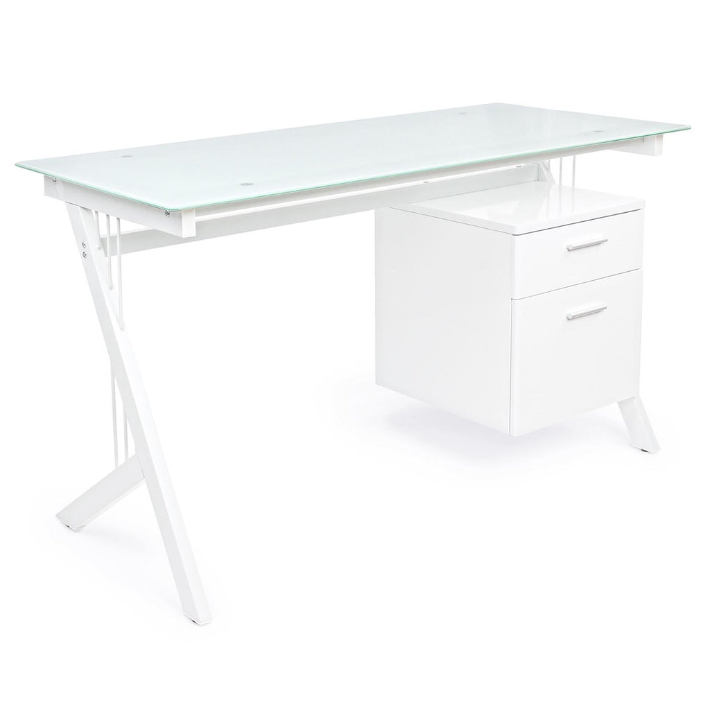 Splendida Scrivania con piano in vetro temperato da 8 mm e cassettiera in pvc , facilissima da montare, moderna, con struttura in ferro verniciata a polvere bianco e che arrederà con gusto il vostro studio o la camera.