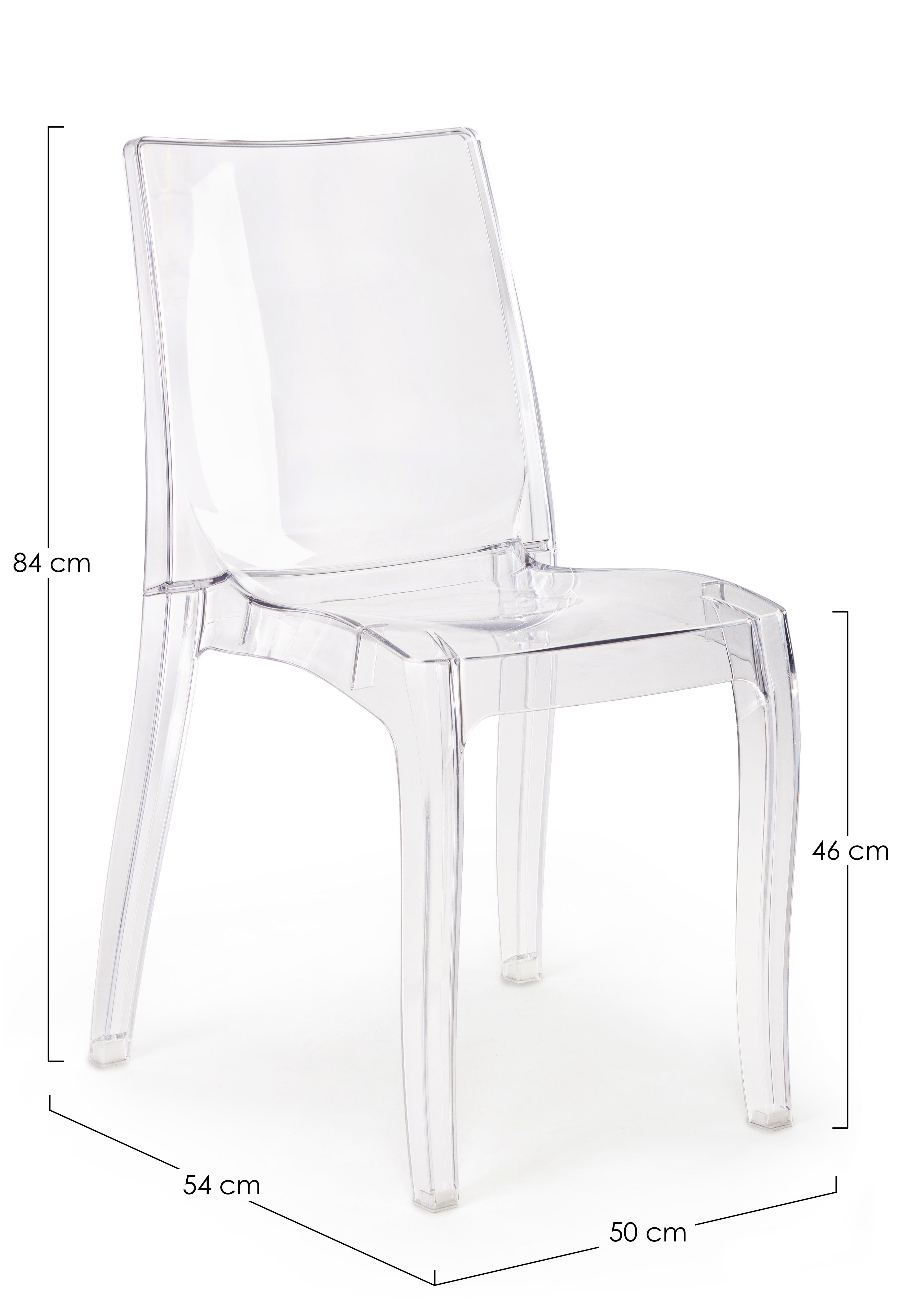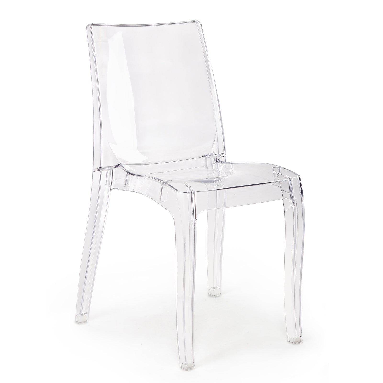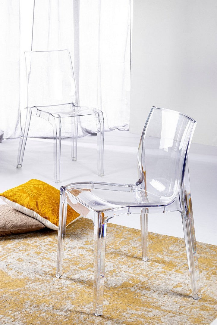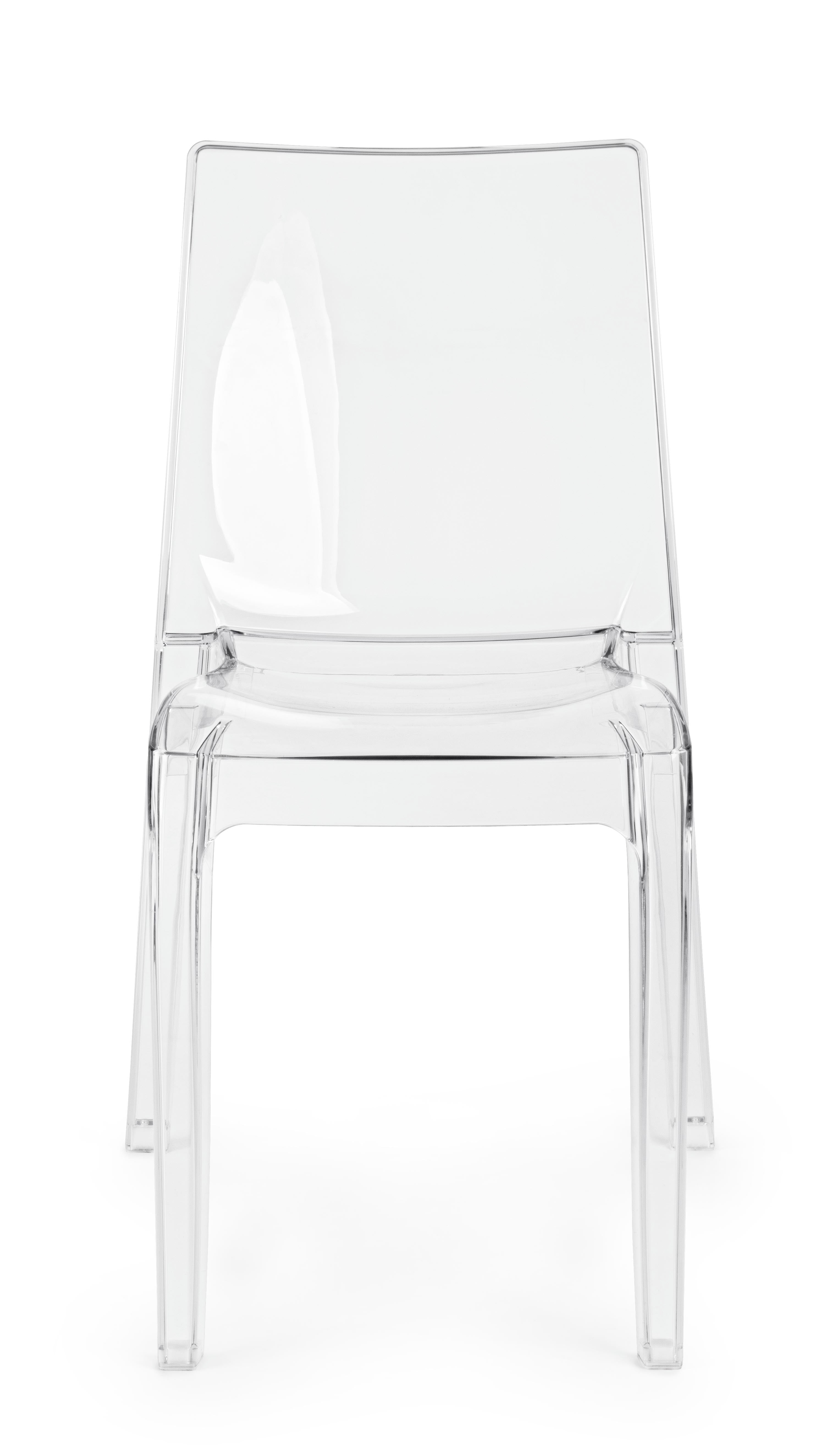 La sedia in policarbonato trasparente, combina le linee di un design classico con l'uso di materiali industriali per la realizzazione.