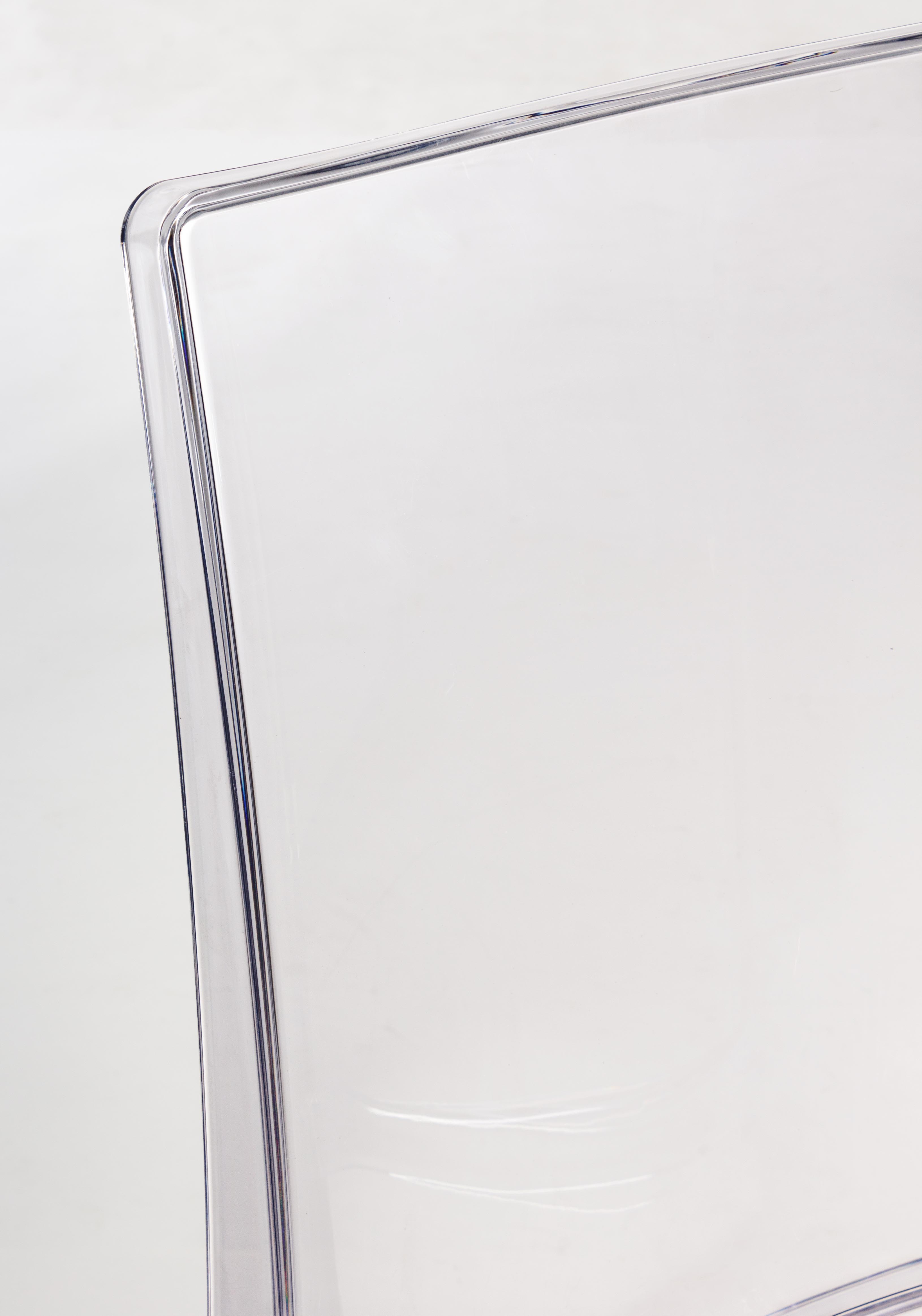 Per la fabbricazione di questa sedia viene utilizzato il policarbonato, un materiale malleabile che permette di realizzare il modello con finitura totalmente trasparente.