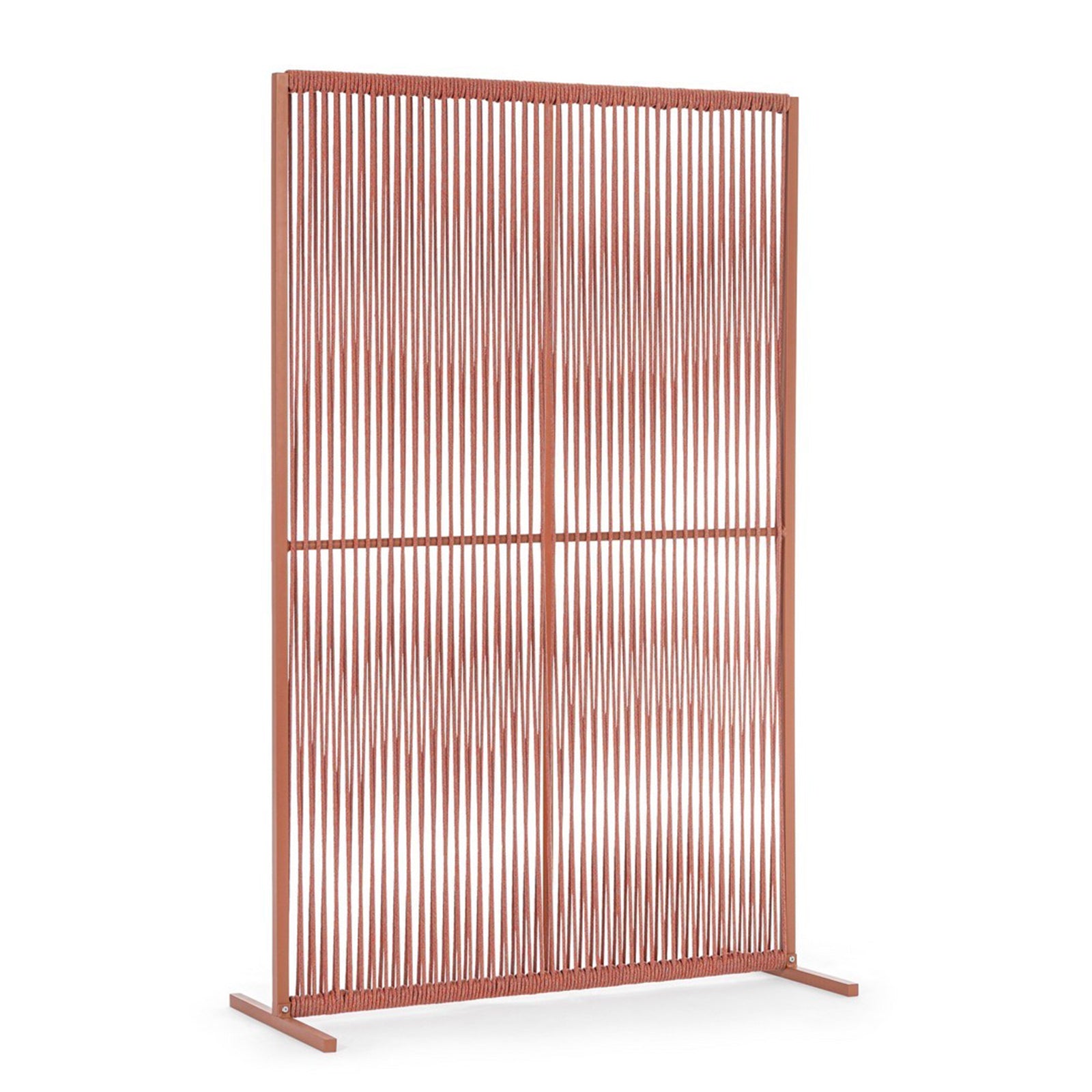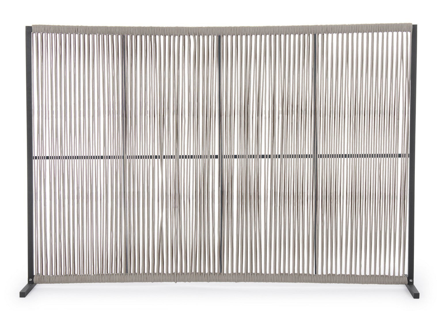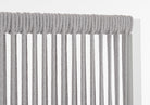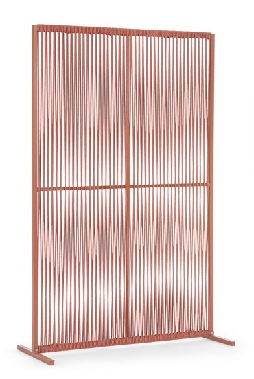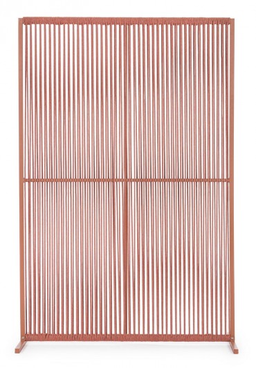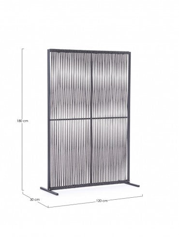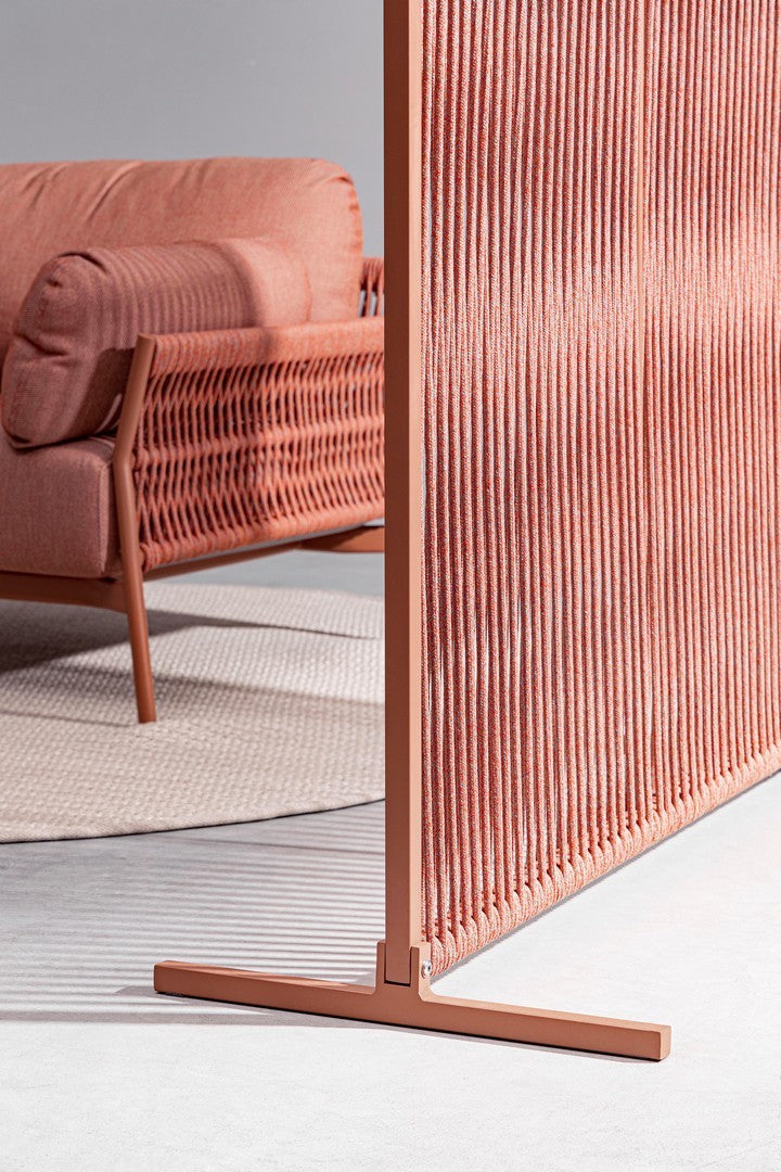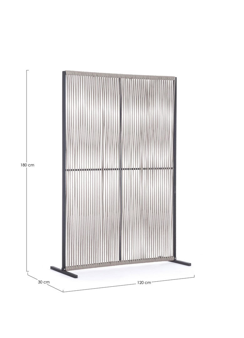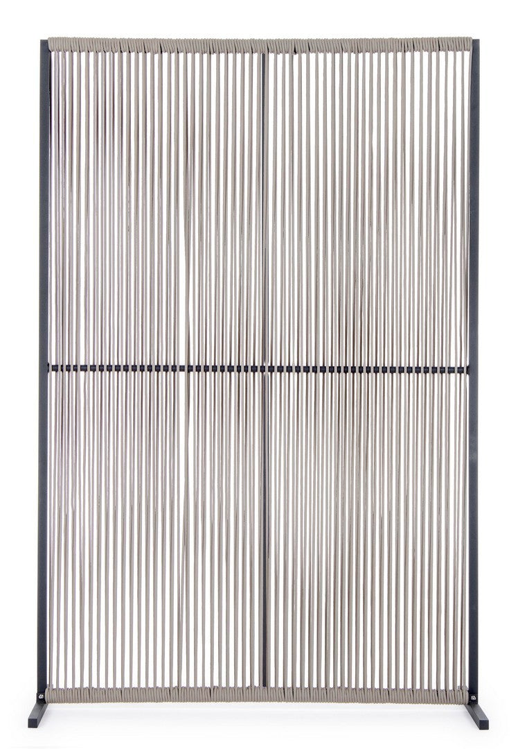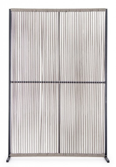 Il motivo dell'intreccio del separè è realizzato con una corda in olefin, un materiale al 100% polipropilene. Questo tipo di corda è noto per la sua resistenza alle intemperie e agli agenti chimici, assicurando che il separè possa essere utilizzato all'esterno senza subire danni. Inoltre, la corda in olefin offre un aspetto naturale ed elegante al prodotto.