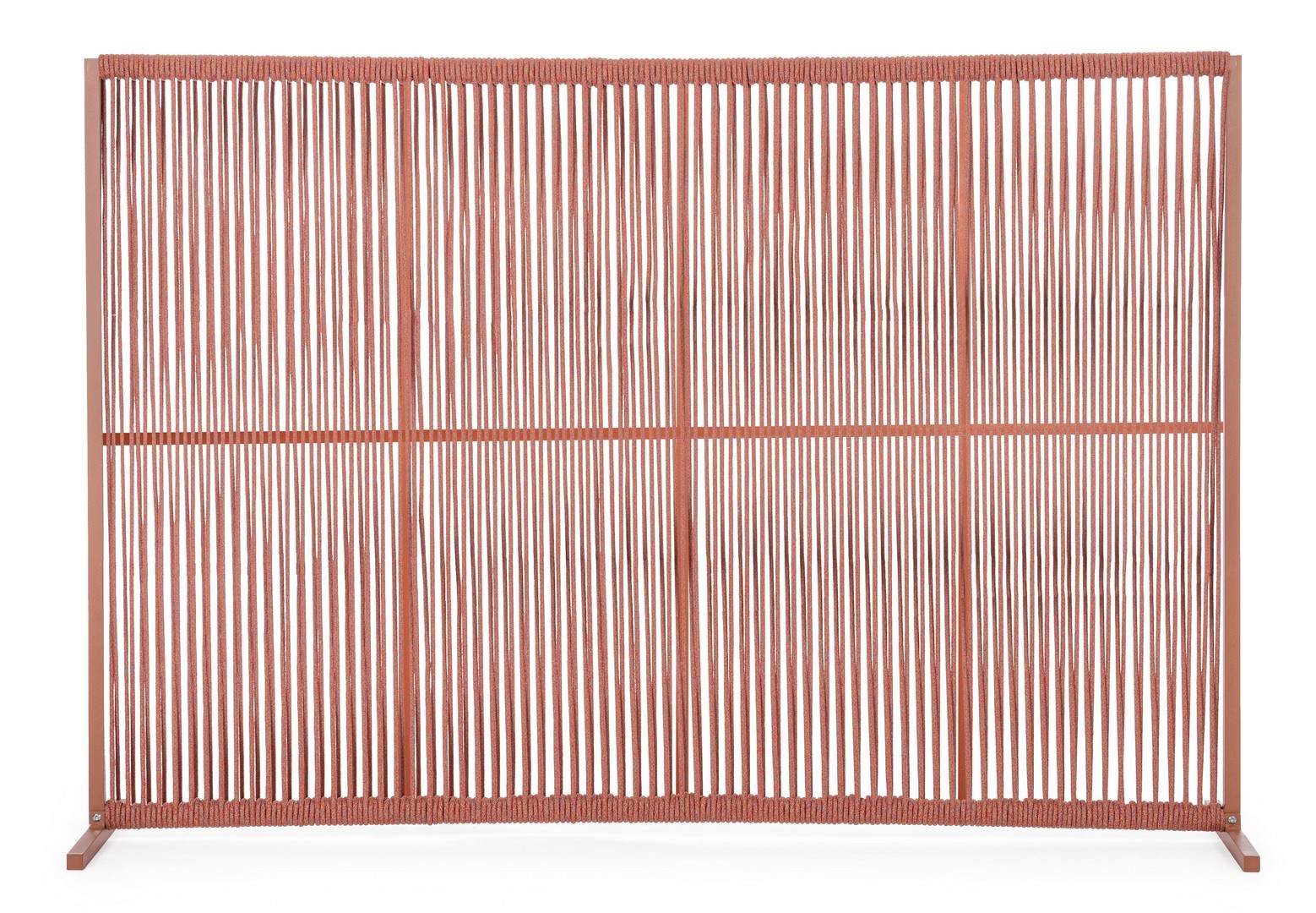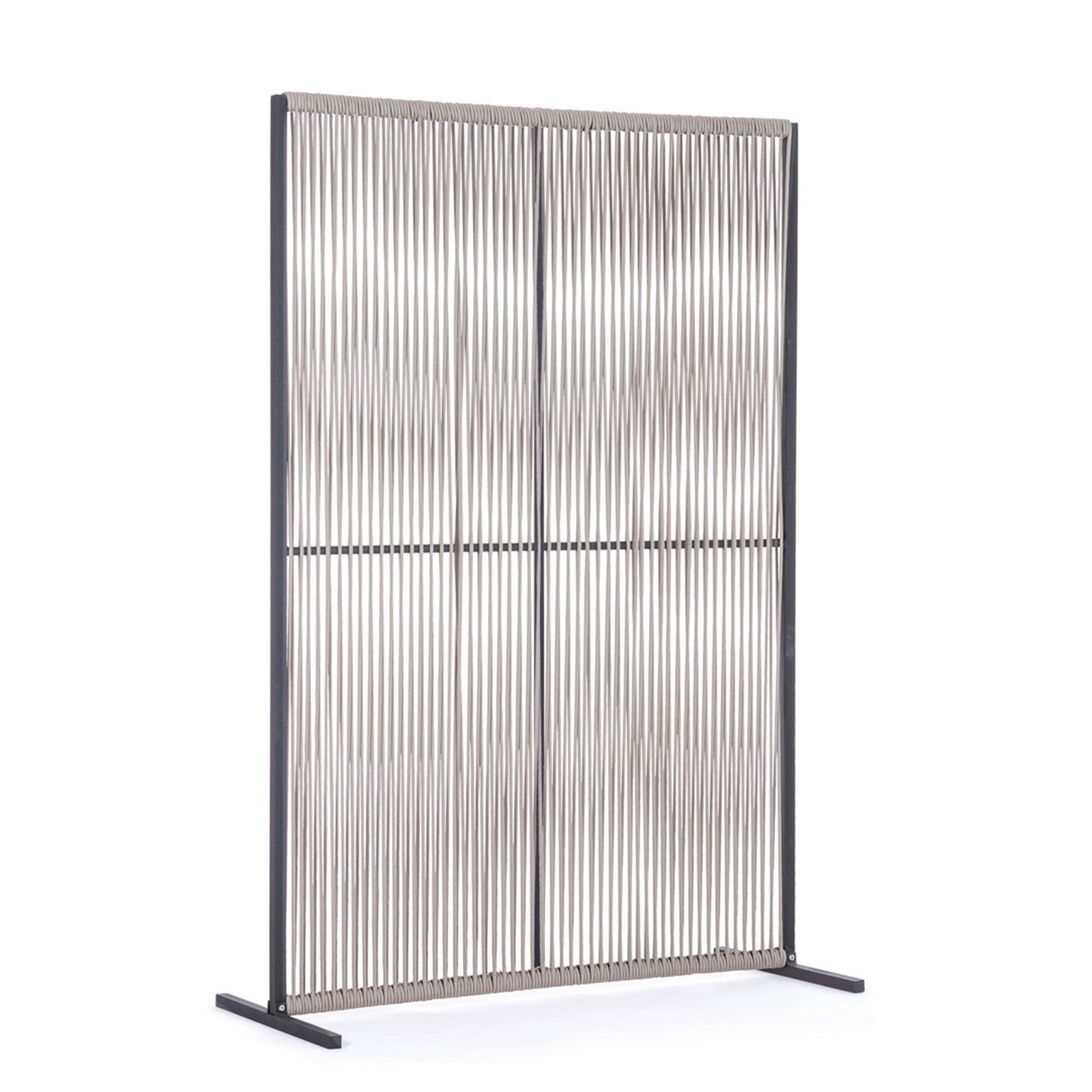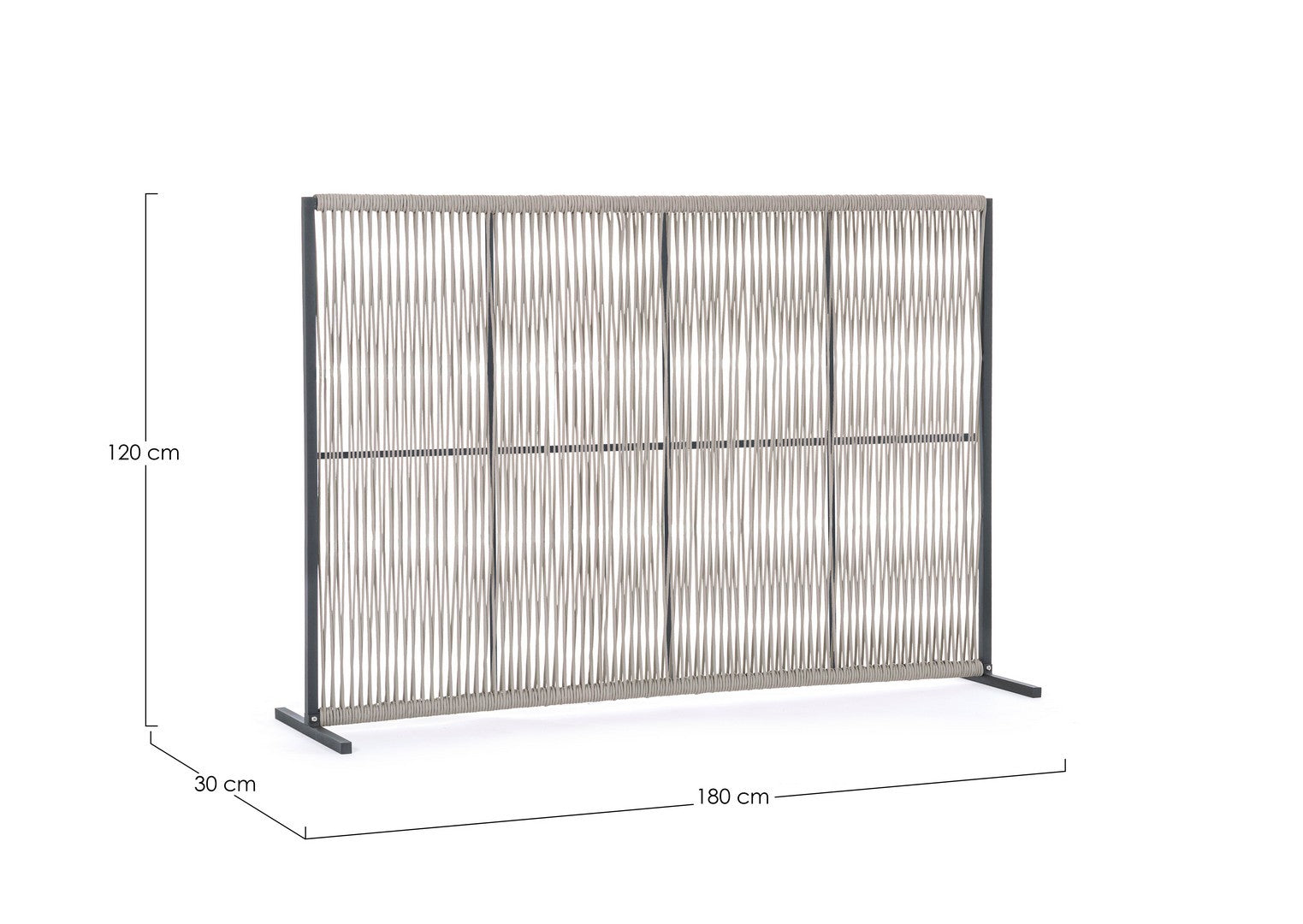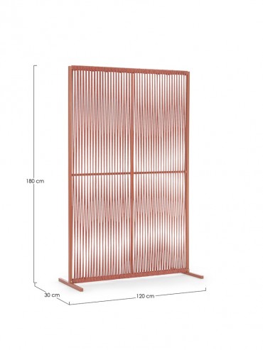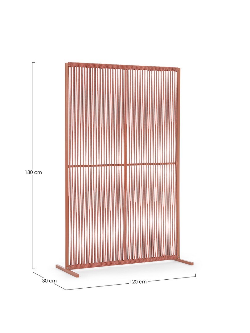 Il motivo dell'intreccio del separè è realizzato con una corda in olefin, un materiale al 100% polipropilene. Questo tipo di corda è noto per la sua resistenza alle intemperie e agli agenti chimici, assicurando che il separè possa essere utilizzato all'esterno senza subire danni. Inoltre, la corda in olefin offre un aspetto naturale ed elegante al prodotto.