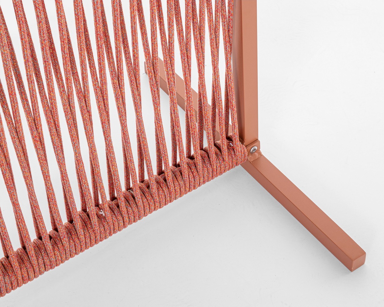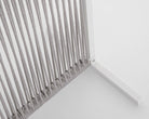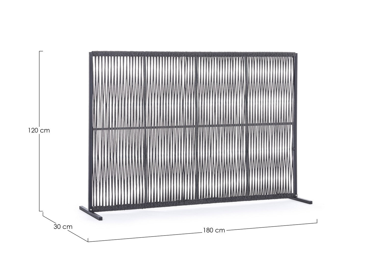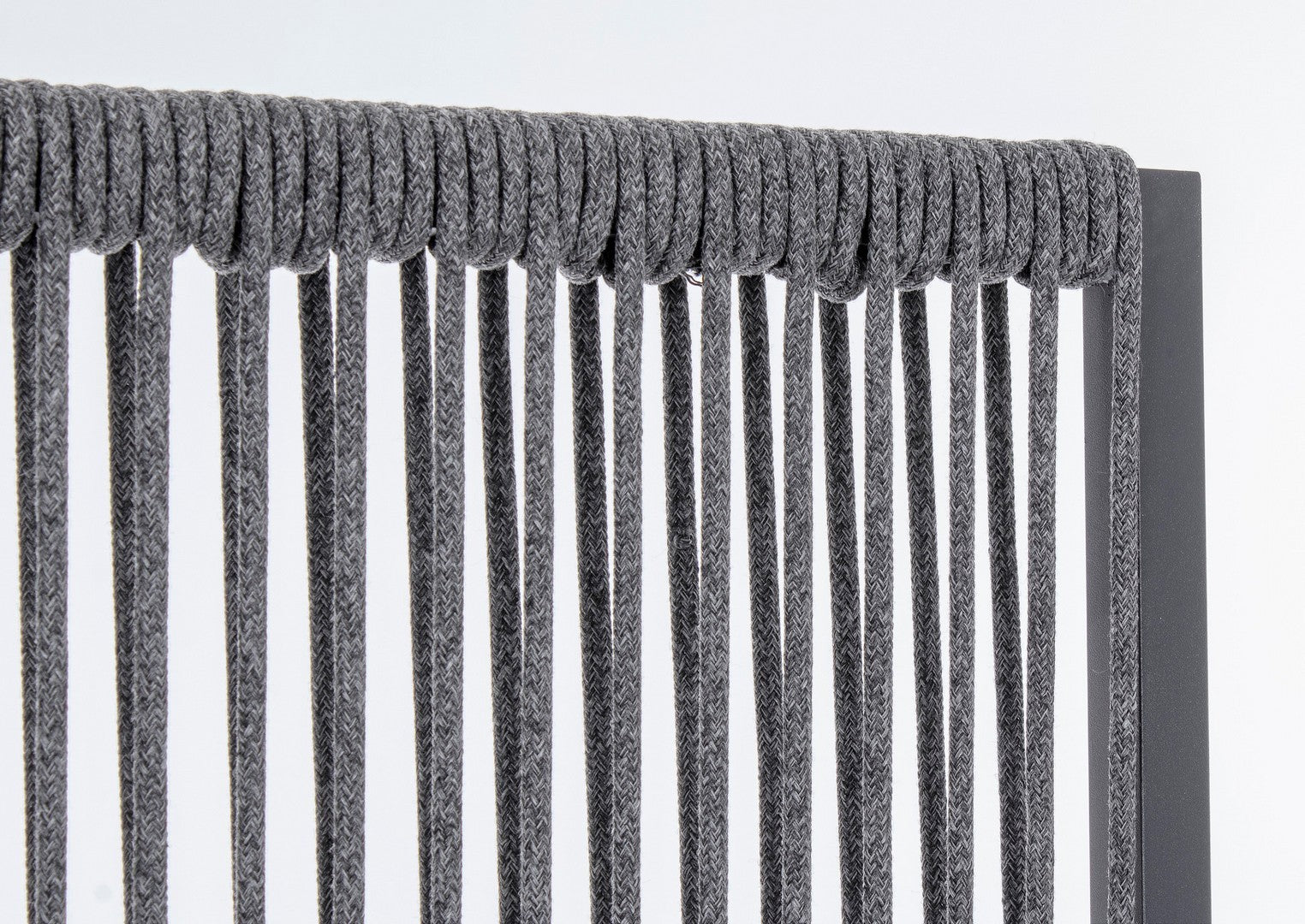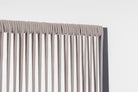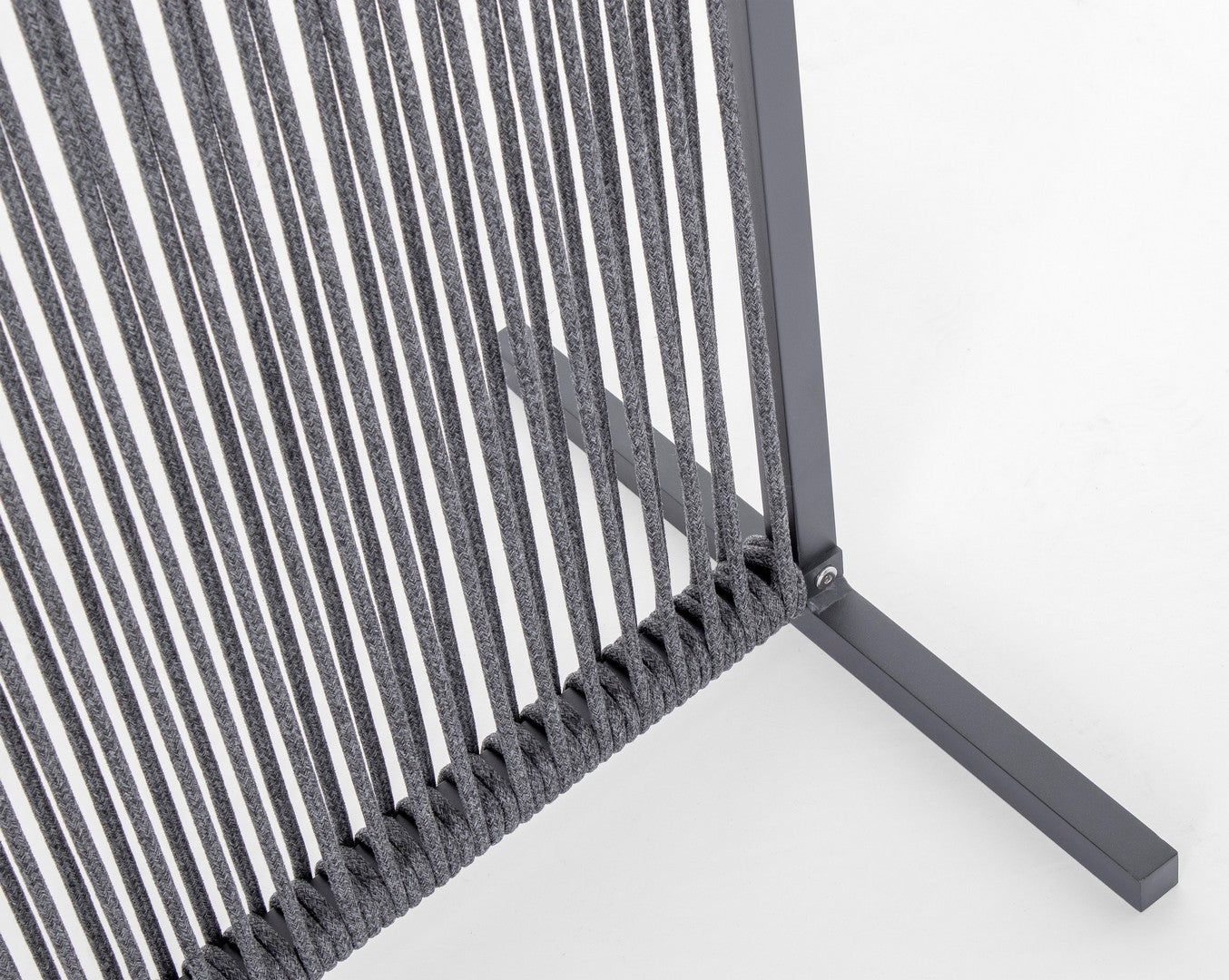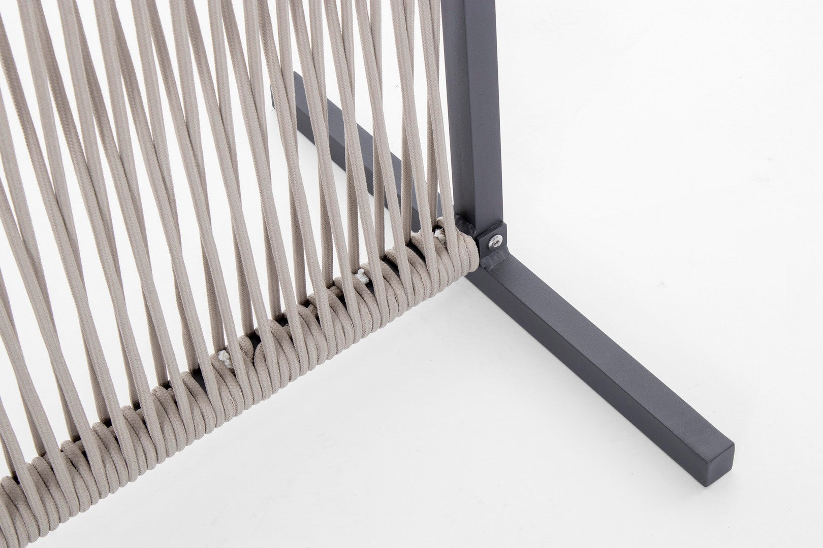 Il motivo dell'intreccio del separè è realizzato con una corda in olefin, un materiale al 100% polipropilene. Questo tipo di corda è noto per la sua resistenza alle intemperie e agli agenti chimici, assicurando che il separè possa essere utilizzato all'esterno senza subire danni. Inoltre, la corda in olefin offre un aspetto naturale ed elegante al prodotto.