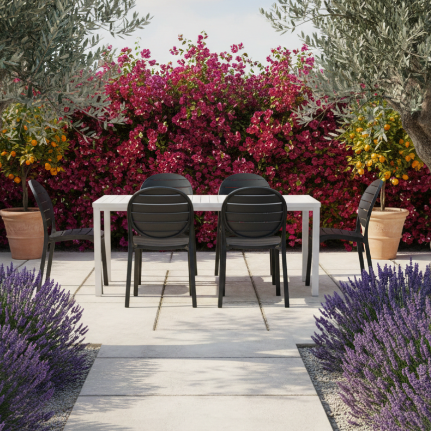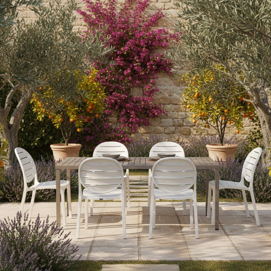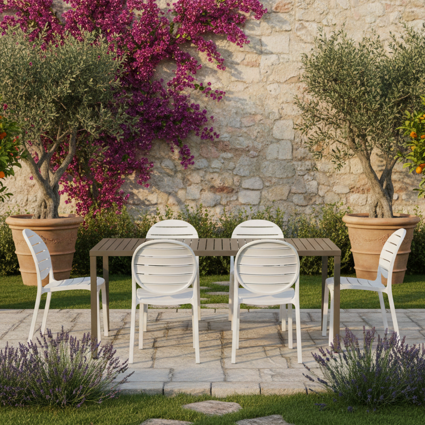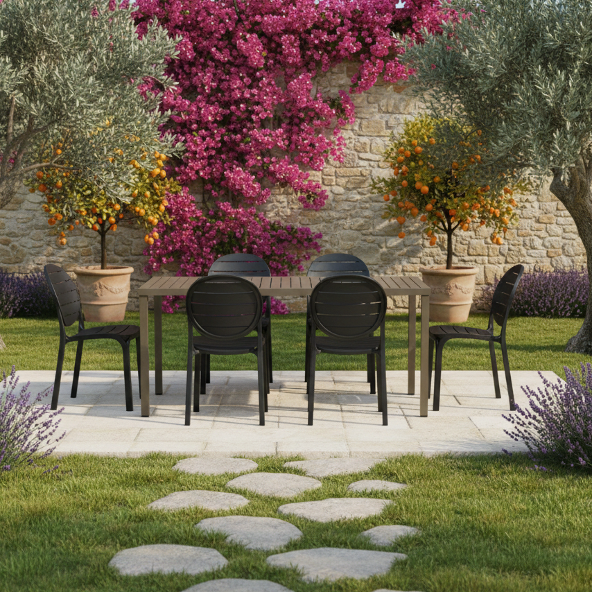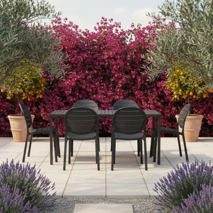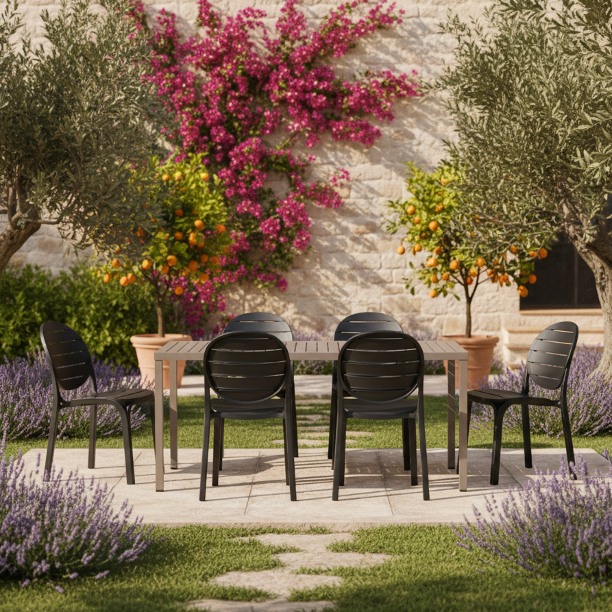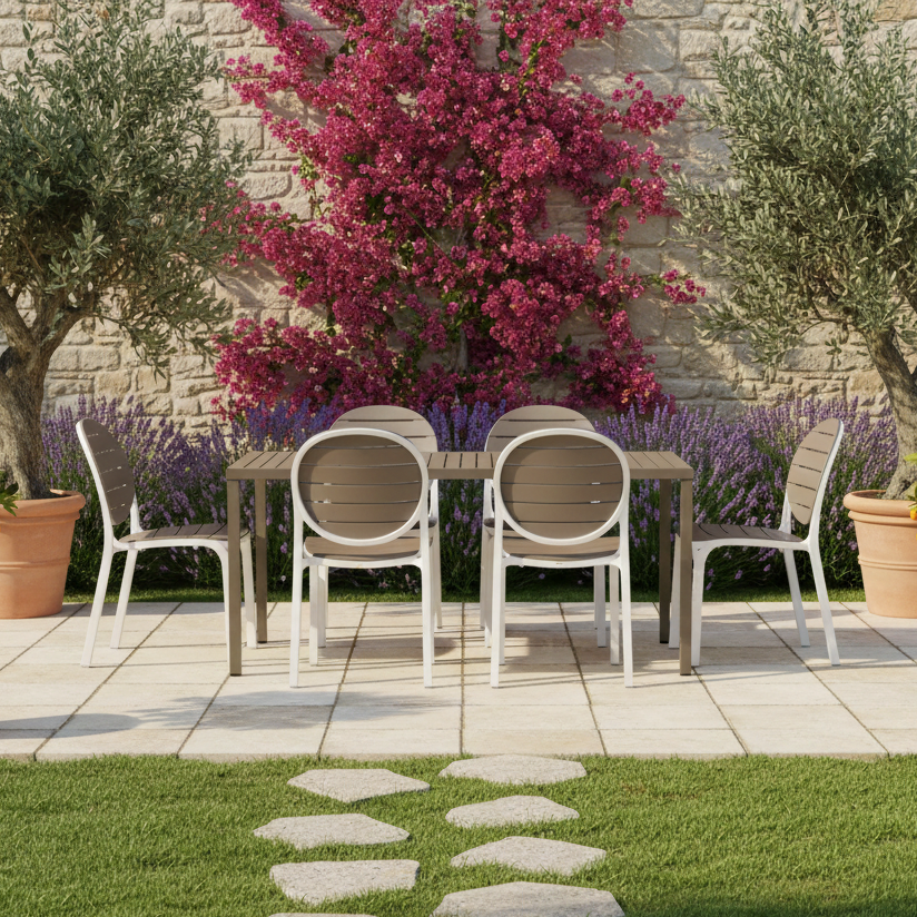 Set tavolo Cube 140x80 con 6 sedie Erica, per esterno e giardino Made in italy