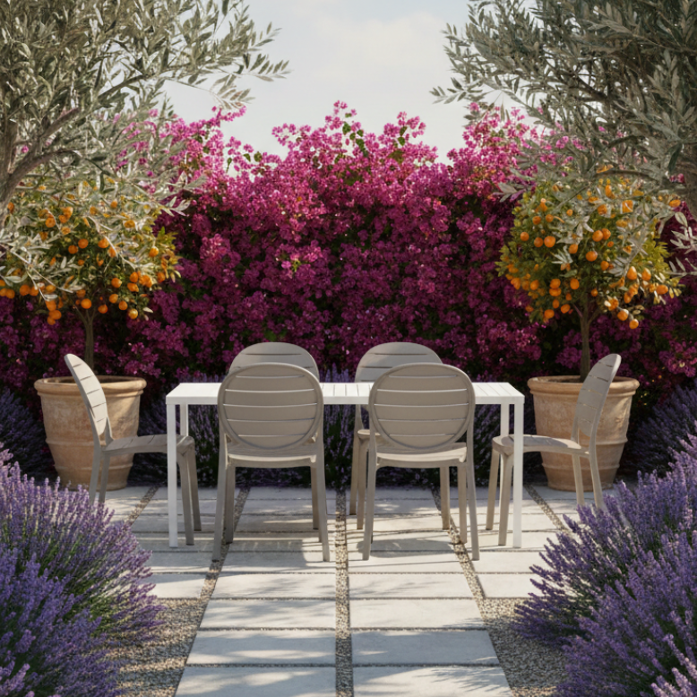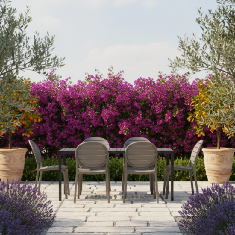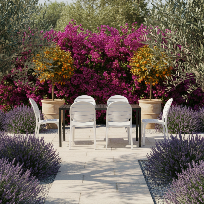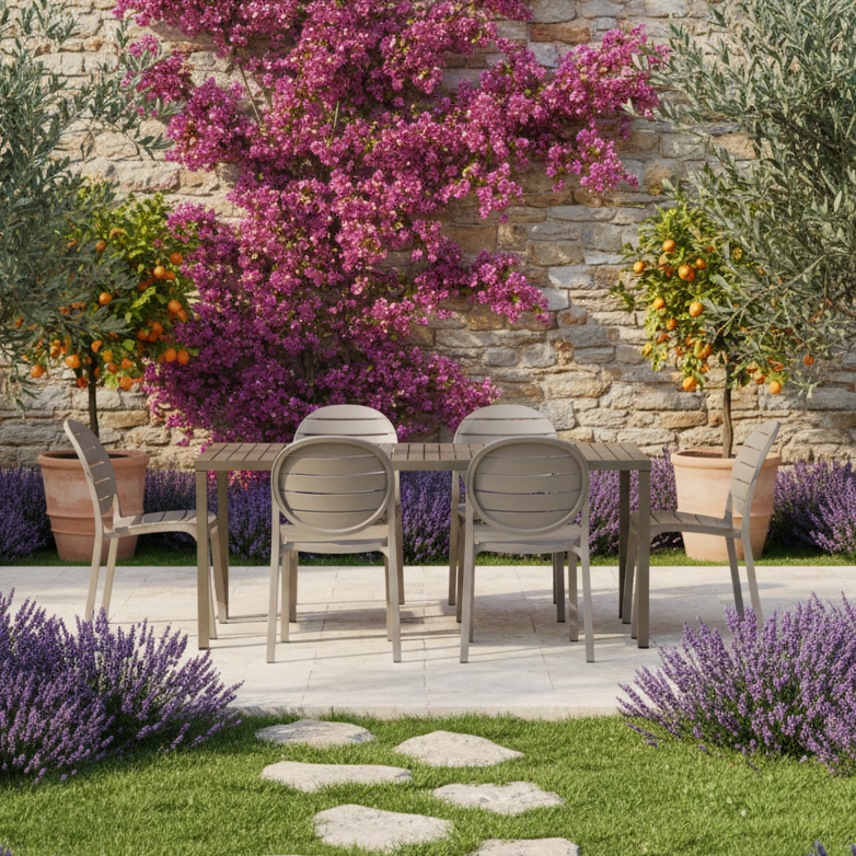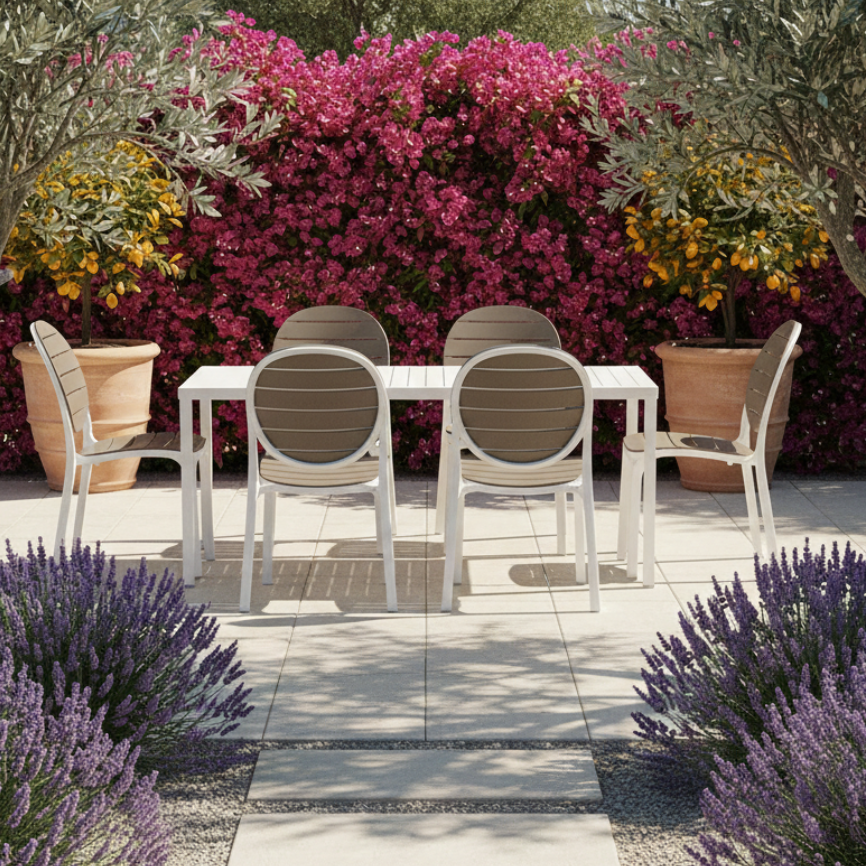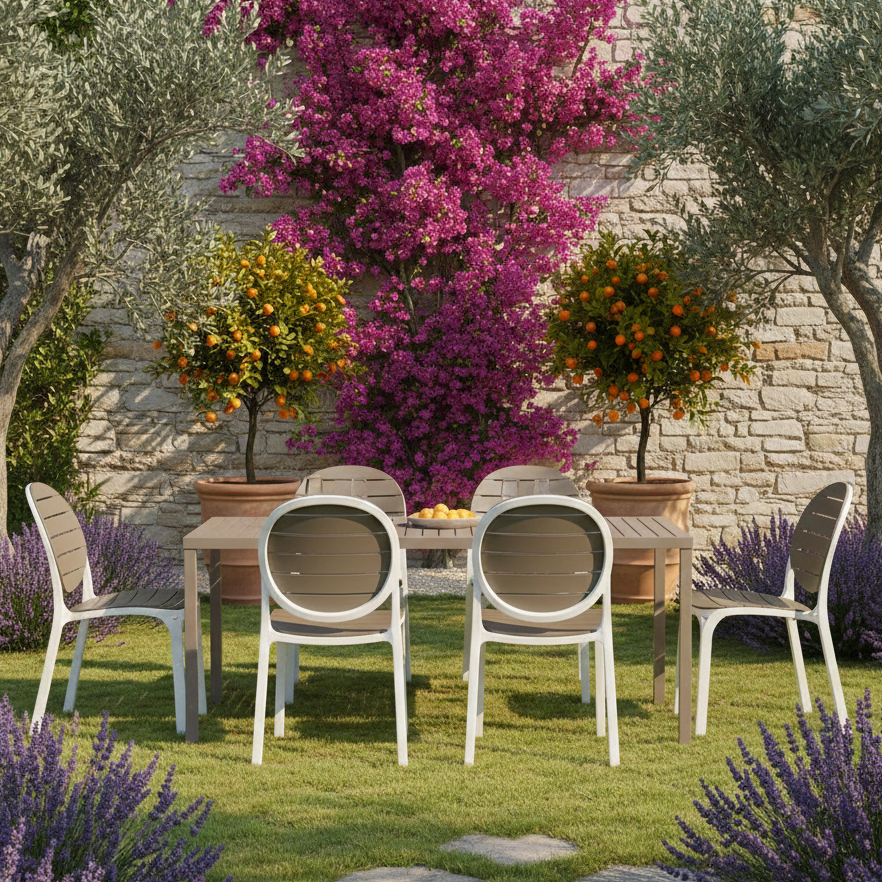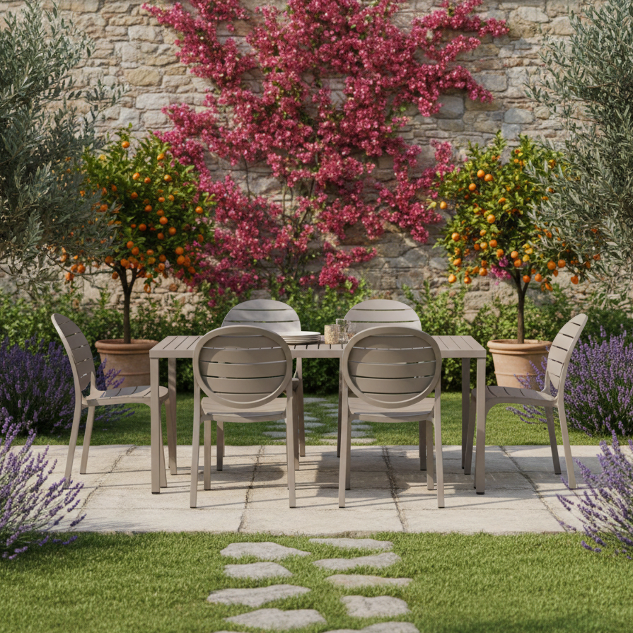 Set tavolo Cube 140x80 con 6 sedie Erica, per esterno e giardino Made in italy