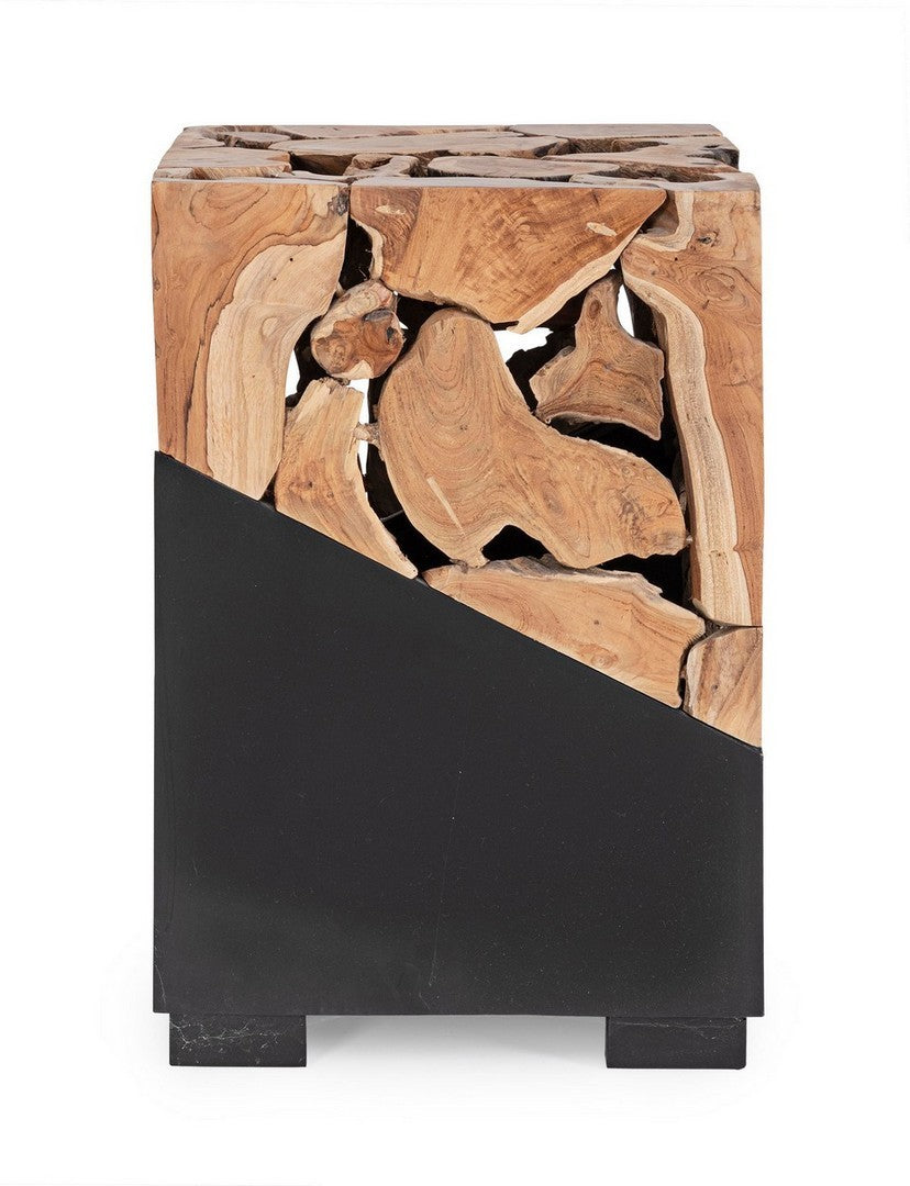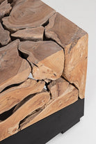 Le radici di teak utilizzate sono irregolari e naturali, conservando le loro forme organiche e donando al tavolino un carattere rustico e originale, in netto contrasto con la base moderna.