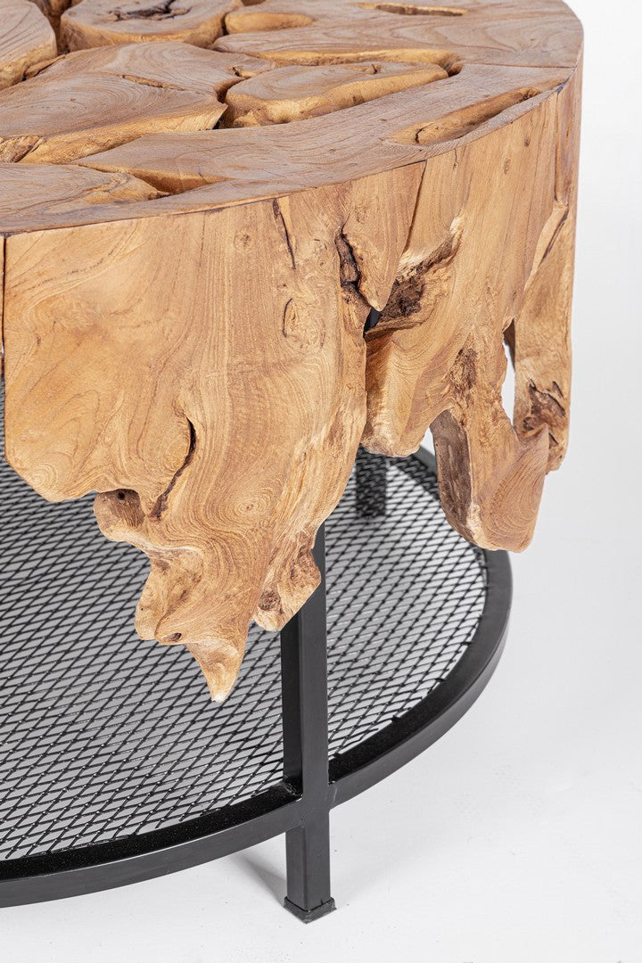 Il piano del tavolino è realizzato in radici di teak, un materiale pregiato e apprezzato per la sua durevolezza e resistenza agli agenti atmosferici, ma soprattutto per la sua bellezza unica.