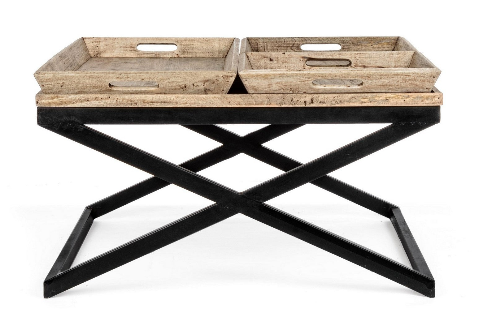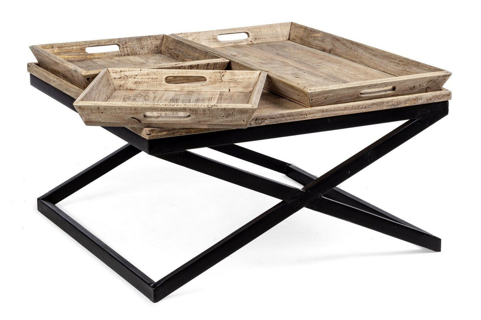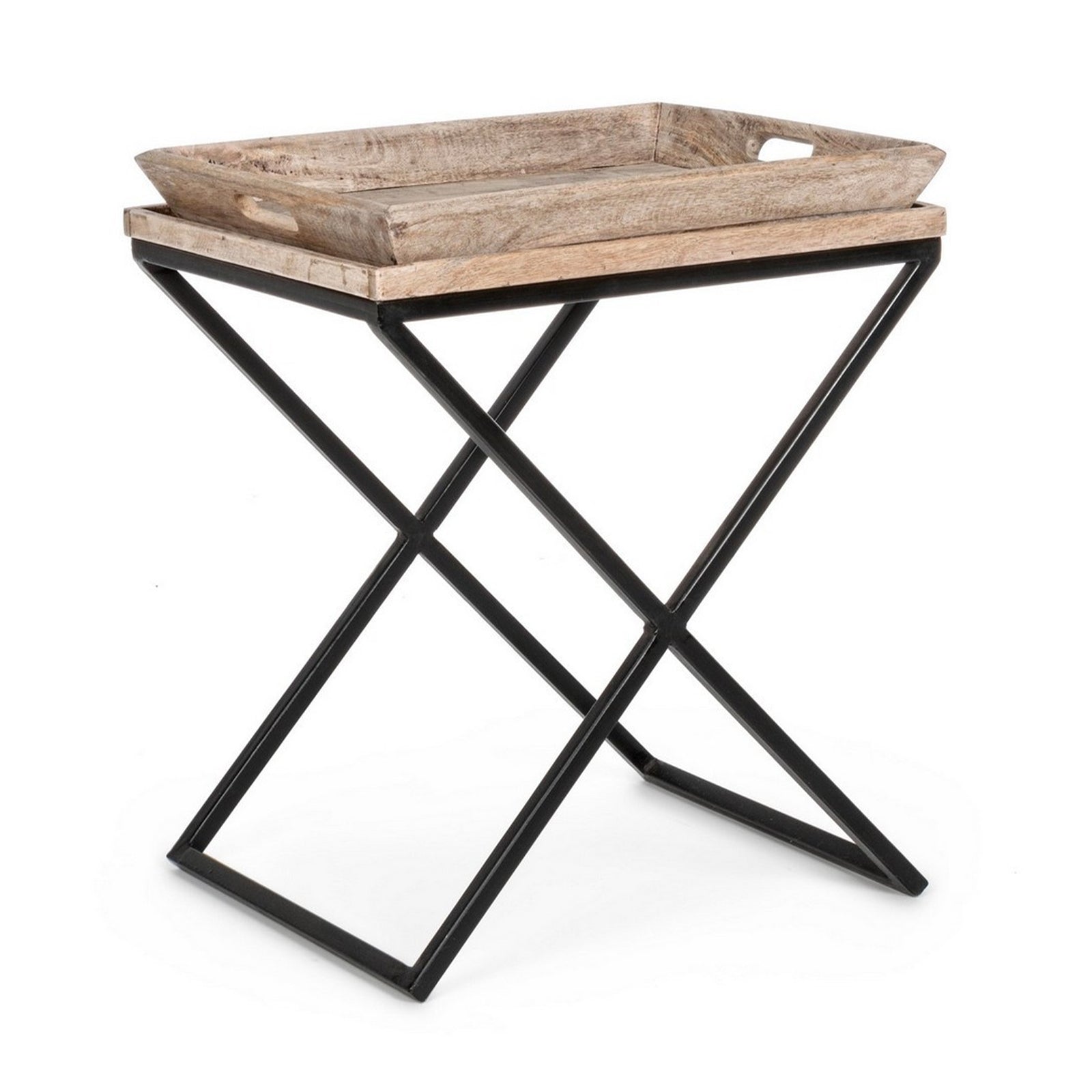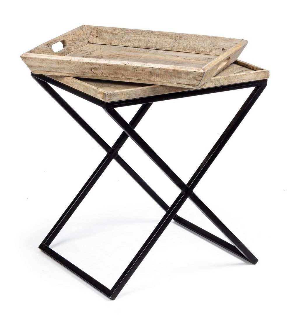 Tavolino "Tray" struttura in acciaio piano in legno di mango per arredamento