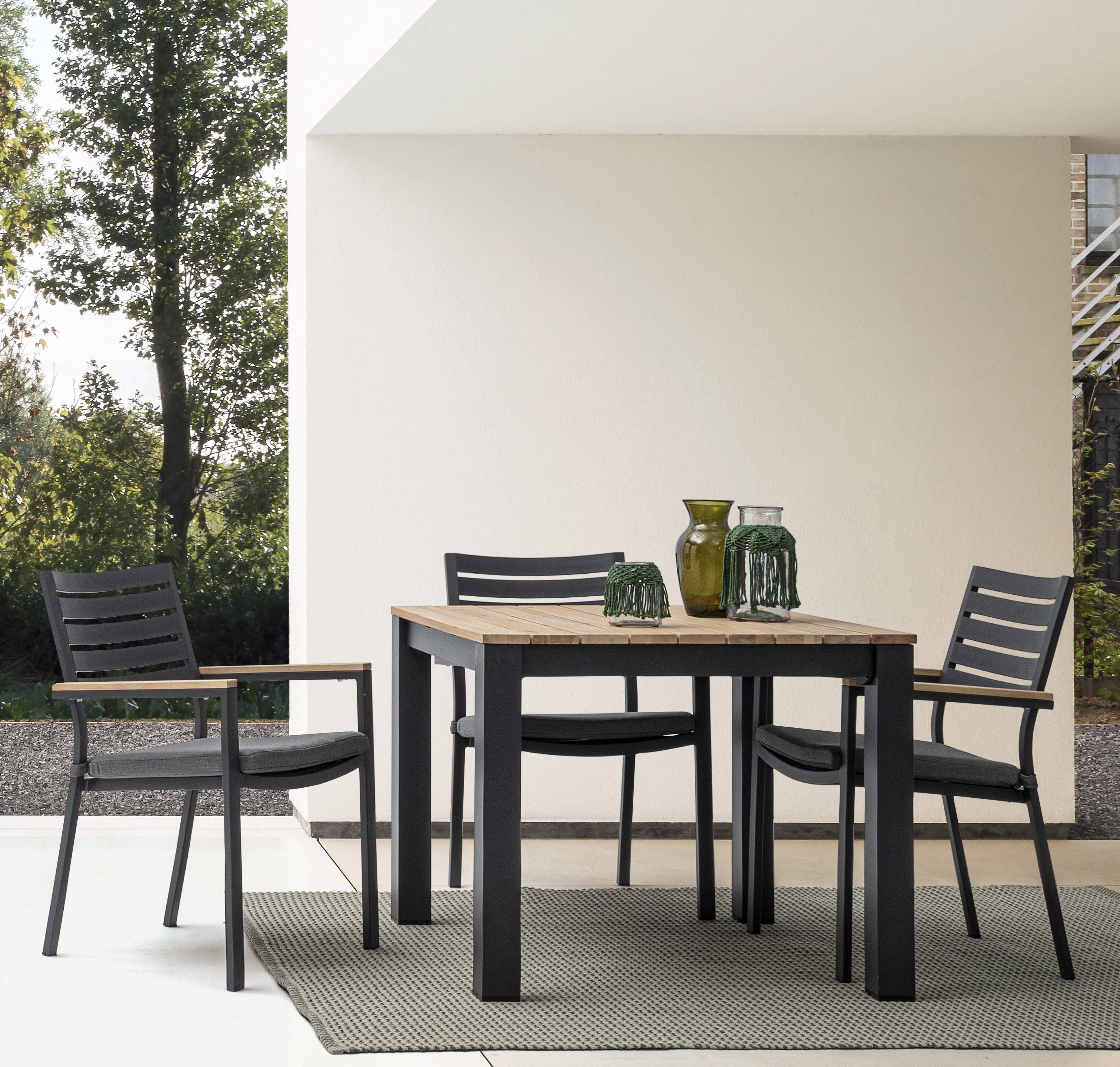 Il tavolo da esterno Kailani è perfetto per la tua zona pranzo all'aperto, per i pranzi in giardino, sul terrazzo o sotto al portico. in alluminio verniciato a polvere nero e piano in legno di acacia.