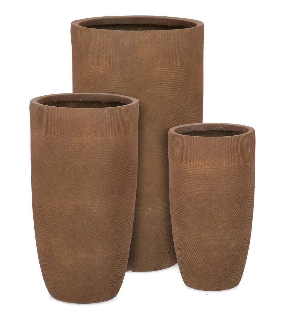 Il set di vasi "Rigo" in fibra di argilla color rusty è composto da tre contenitori raffinati, ideali per abbellire spazi esterni con un tocco di eleganza e modernità.