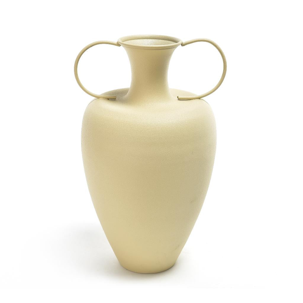 Il vaso bottiglia tondo con manici in metallo è un elegante e pratico accessorio decorativo, perfetto per dare un tocco di stile a qualsiasi ambiente, sia interno che esterno.