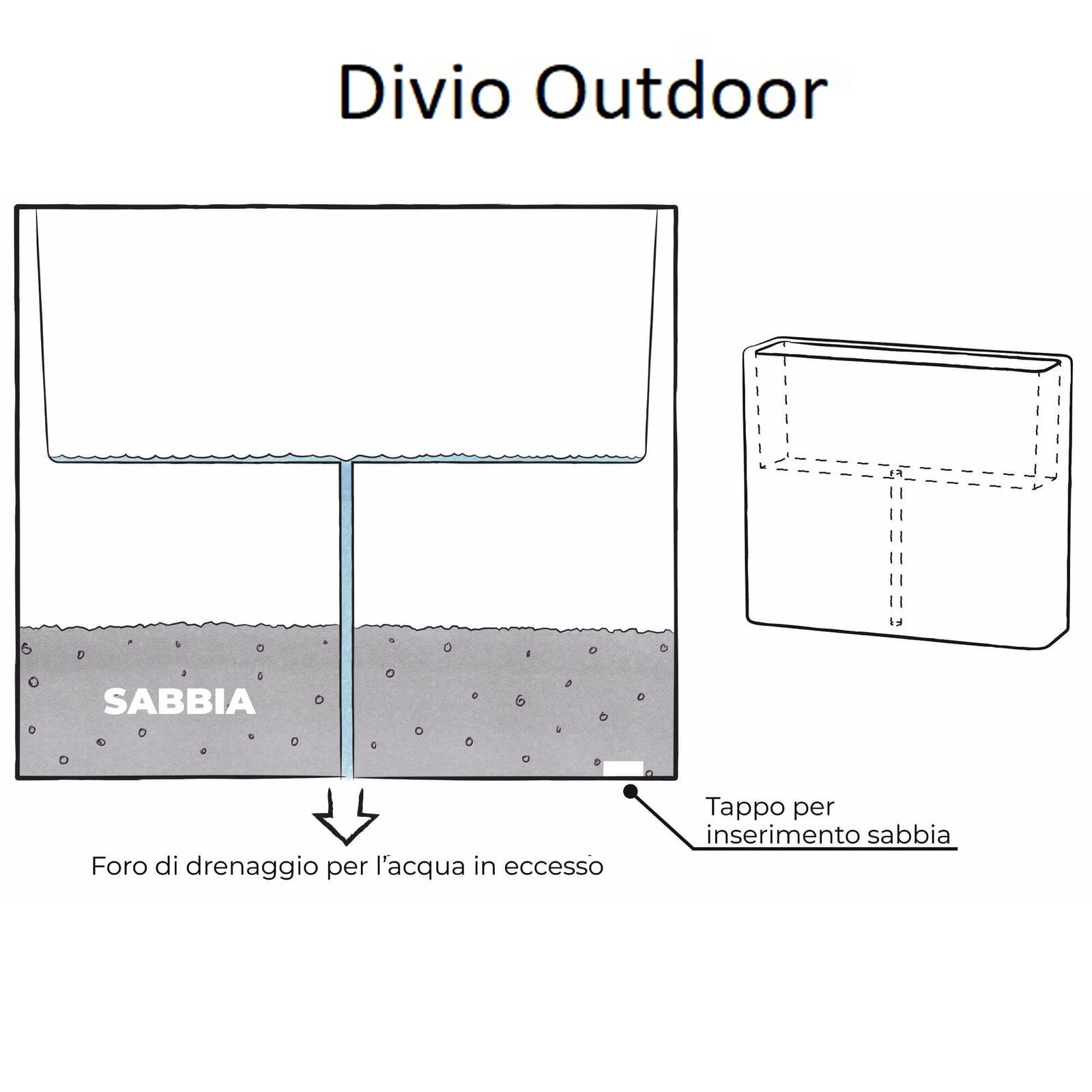 Divio Outdoor è munita di un canale di scarico dell'acqua in eccesso che può crearsi con la pioggia o con una innaffiatura errata.